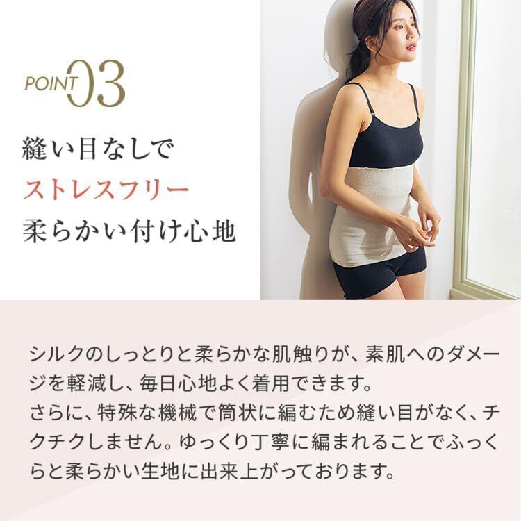 ■商品説明 多数の温活アイテムを扱うミッシーリストの大人気アイテムの「シルク腹巻」。着心地がいい上に、優秀な保温・保湿効果で冷えを防ぐので女性や妊婦さんから大人気。使い続けるうちに代謝のいい温かい身体をキープしてくれます。多くのママ向け雑誌やメディアでご紹介いただいる理想のインナー「シルク腹巻」は、縫い目がなく着心地が良い。伸縮性が良くストレスフリー。温かいのに薄く、着ぶくれしない。洗濯機で洗えるためお手入れも簡単。このように、1年中美容や健康のために「温活」を続けてほしいからこだわりの特徴が多くあります。また、ミッシーリストで扱うシルクは日本でわずかしかない特殊な機械を使って丁寧に編み上げて作られています。秋冬の冷え対策だけでなく、春夏の冷房対策にも最適です。シルク腹巻のカラーバリエーションはブラック(黒)、ピンク、ホワイト(白)・グレーからお選びいただけます。 (複数枚ご購入の場合、旧パッケージと新パッケージの商品が混在する場合がございます。 商品は同一のものですのご安心くださいませ) ■原材料 綿75%、シルク20%、弾性糸5% ■サイズ ウエスト約50センチ~100センチ(大きく伸縮します) ■カラー ブラック・ピンク・ホワイト・グレー ■原産国 日本