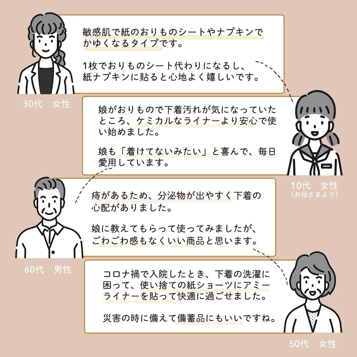 【使い捨て布ナプキンのパイオニアがお届けする安心・安全設計】アミーは日本で初めて「ズレ防止テープ付きの使い捨て布ナプキン(取得(第6934204号)」を取得。ライナー裏面のテープ位置がやや内側にあるためショーツのクロッチ幅を選ばず、テープが肌にふれにくい安心設計でおつくりしています。お肌に触れるものだから、とことんこだわりました!