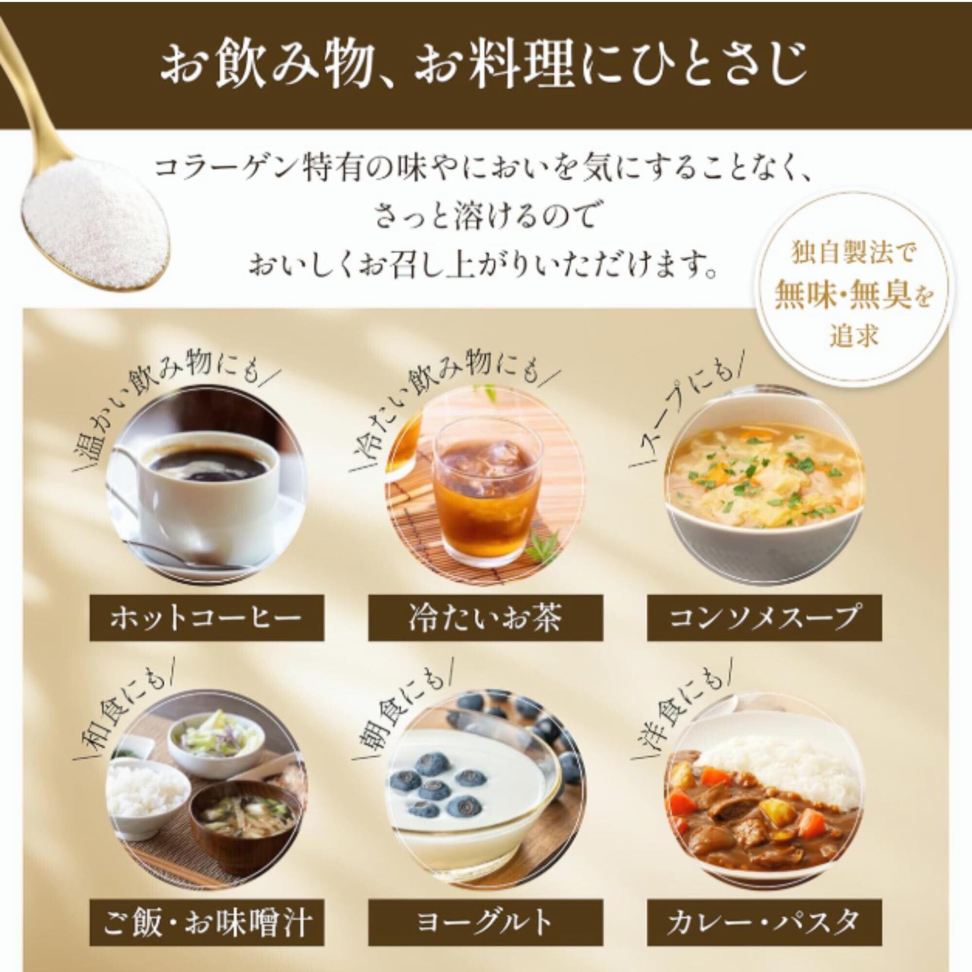 【無味無臭を追求】独自の製法で、コラーゲン特有の風味を 徹底的に抑えました。初回抽出分のみを贅沢に使用した純度 100%の一番しぼりコラーゲンを厳選使用。