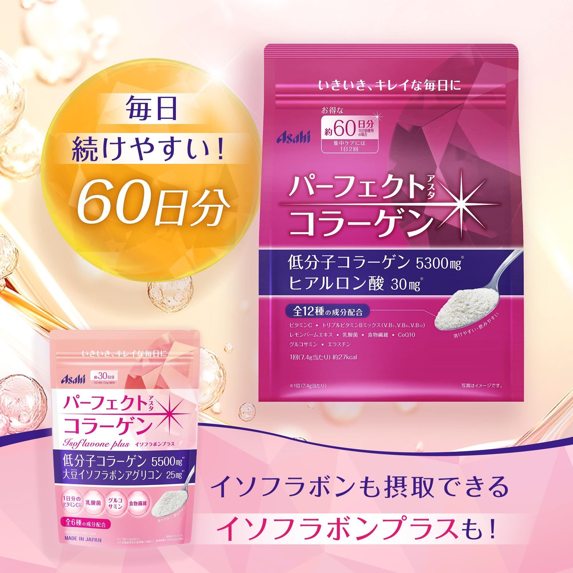1日2回使っても30日分楽しめるボリューム感。もっとキレイを磨きたい女性には1日2回がオススメ!!低分子コラーゲンや美体質乳酸菌など、パーフェクトアスタコラーゲンの12数類の美容系成分はそのままに、お得価格が嬉しい60日分が新登場。ハリ・つや・潤いのための12種類の成分でキレイパワーをチャージします。