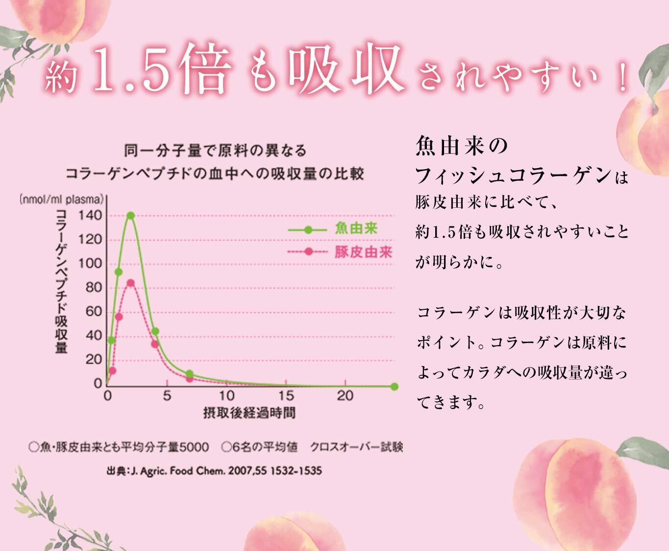粉末コラーゲンNo,1の「アミノコラーゲン」と同等量である低分子化フィッシュコラーゲンペプチド:5000mg/本を配合しています。