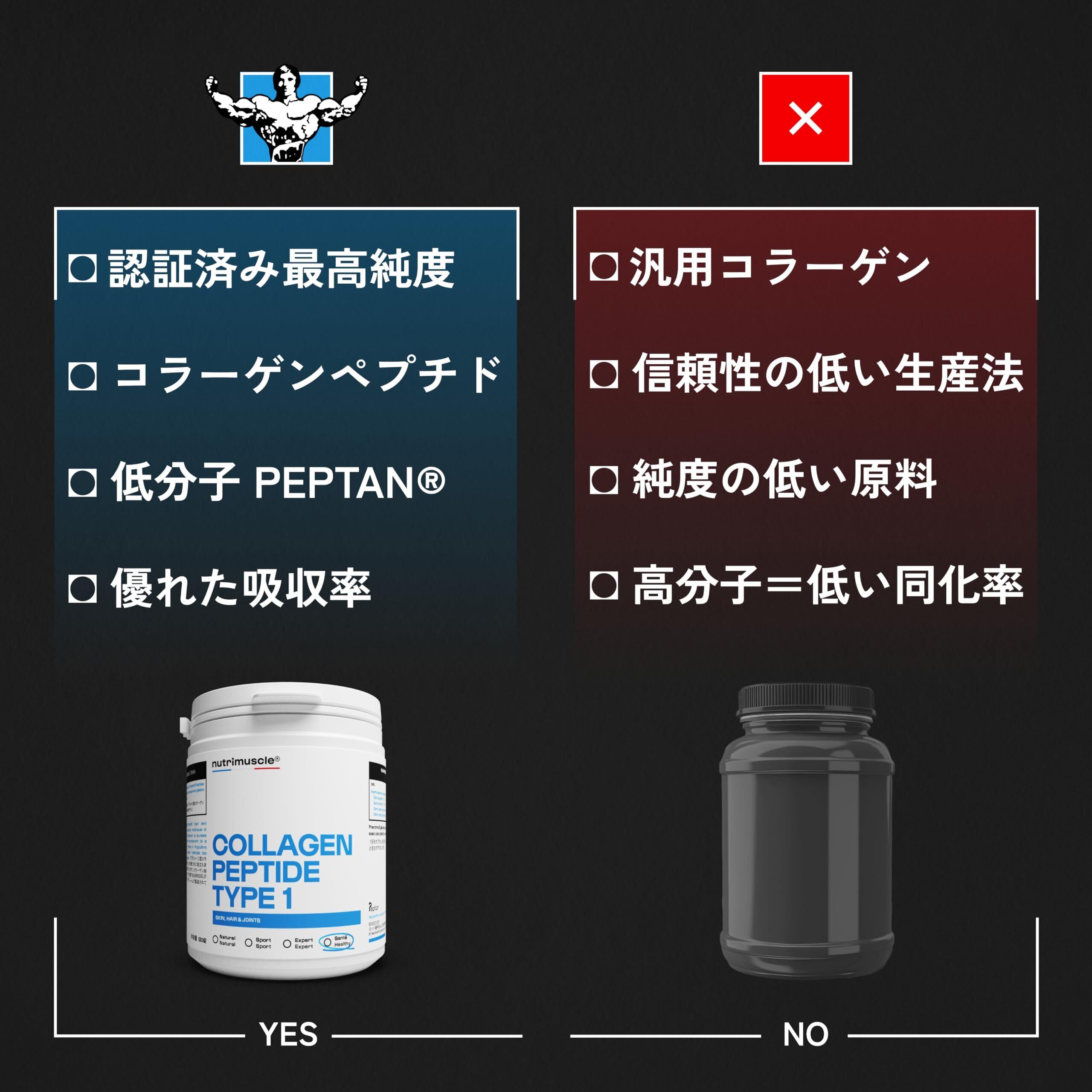 【確かな品質と純度】NutrimuscleのコラーゲンペプチドI型はフランス産の牛由来です。コラーゲン製造において実績のある企業Rousselot社の製法により製造されたものを採用。タンパク質90%以上を含有し、不要な添加物・香料・人工甘味料・天然甘味料も一切不使用。