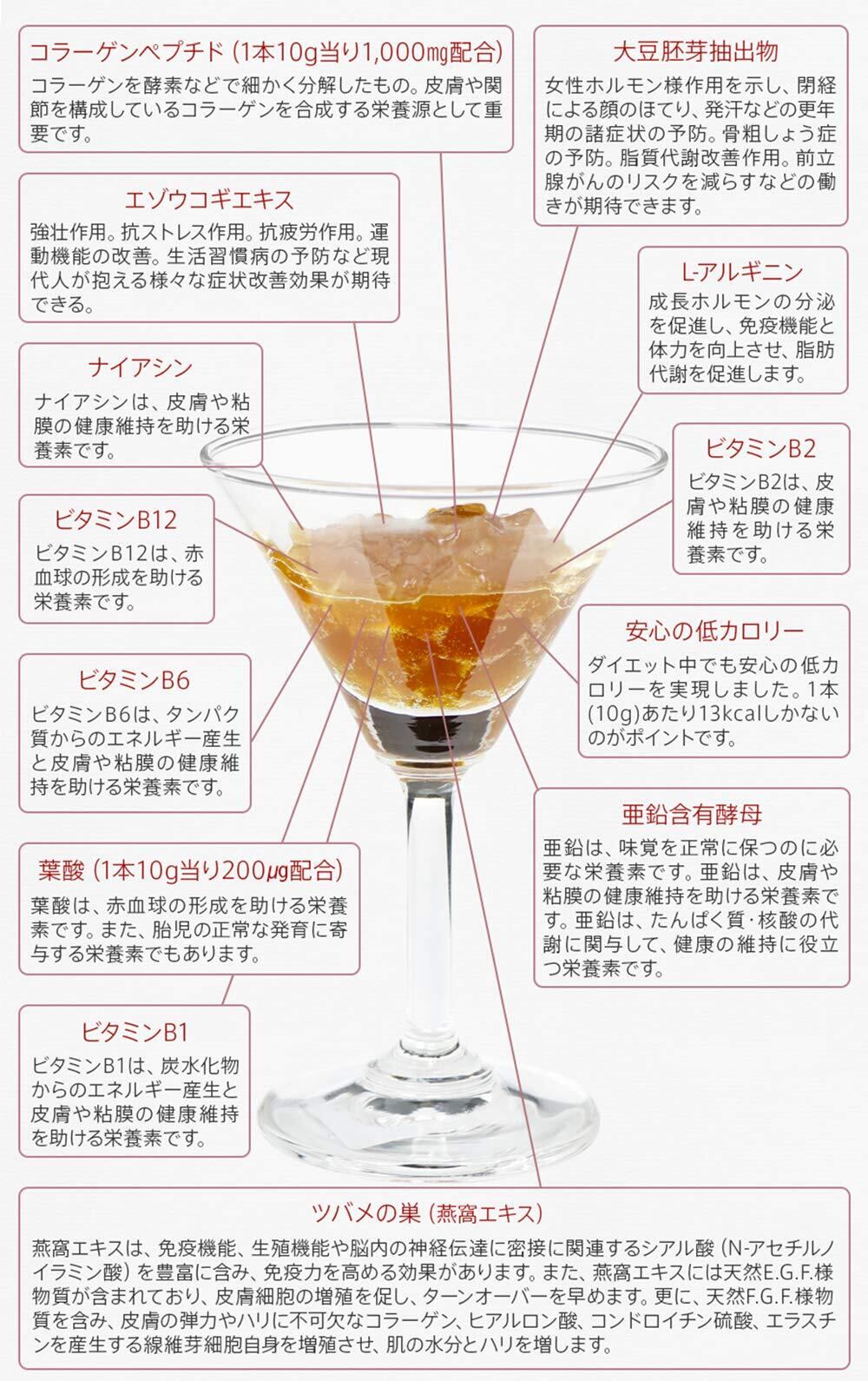 成分:コラーゲンペプチド(ゼラチン、魚介類由来)、還元麦芽糖水飴、果糖、ザクロ果汁、燕の巣エキス、エゾウコギエキス、寒天、大豆胚芽抽出物、亜鉛含有酵母/ゲル化剤(増粘多糖類)、酸味料、ビタミンC、香料(ザクロ)、L-アルギニン、ナイアシン、ビタミンB2、ビタミンB6、ビタミンB1、葉酸、ビタミンB12