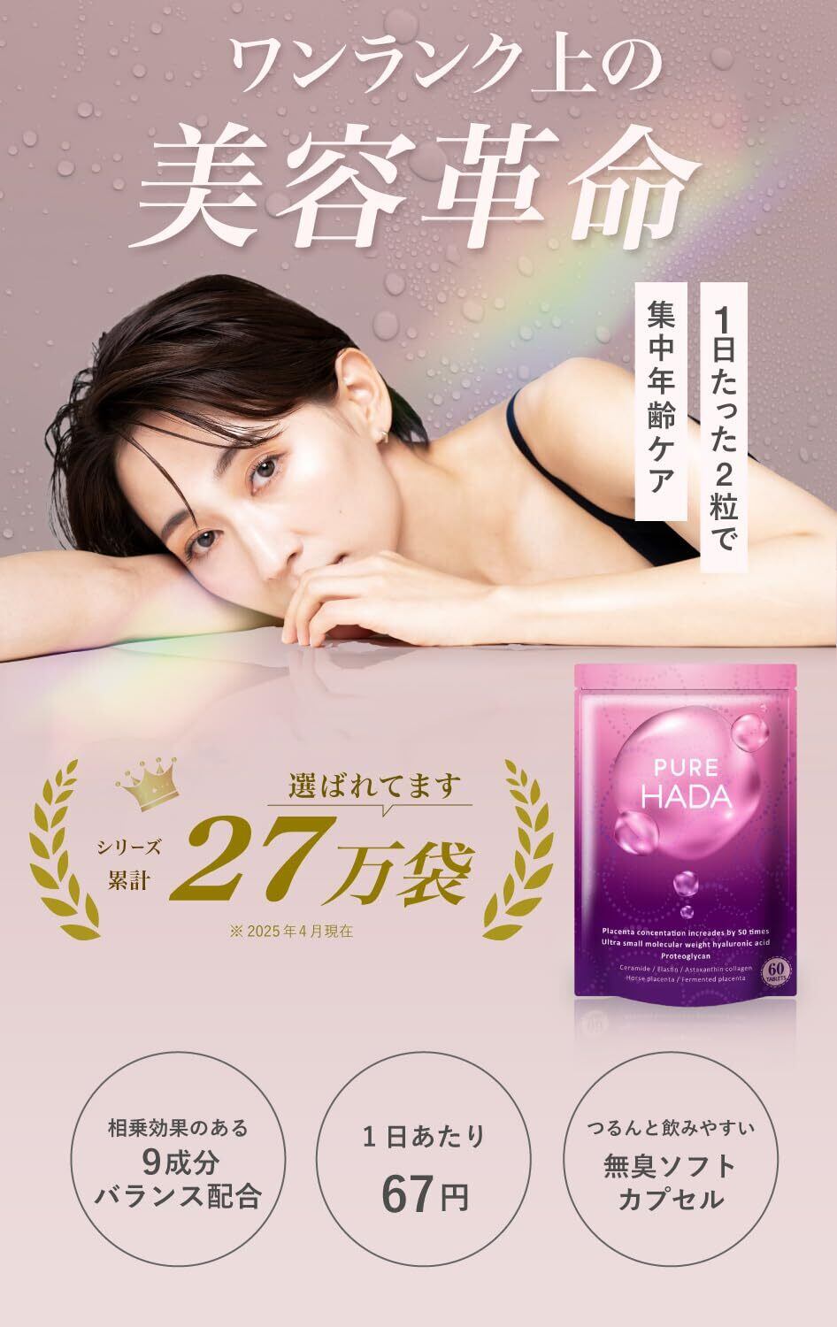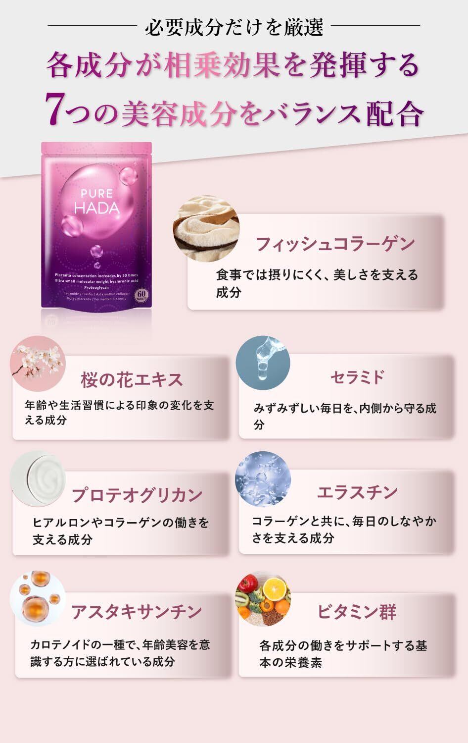 「 PUREHADA 」見た目に差が出る。3年後も自信がもてる。飲むだけの美容革命。インナーケアに特化した オールインワン美容サプリメント。