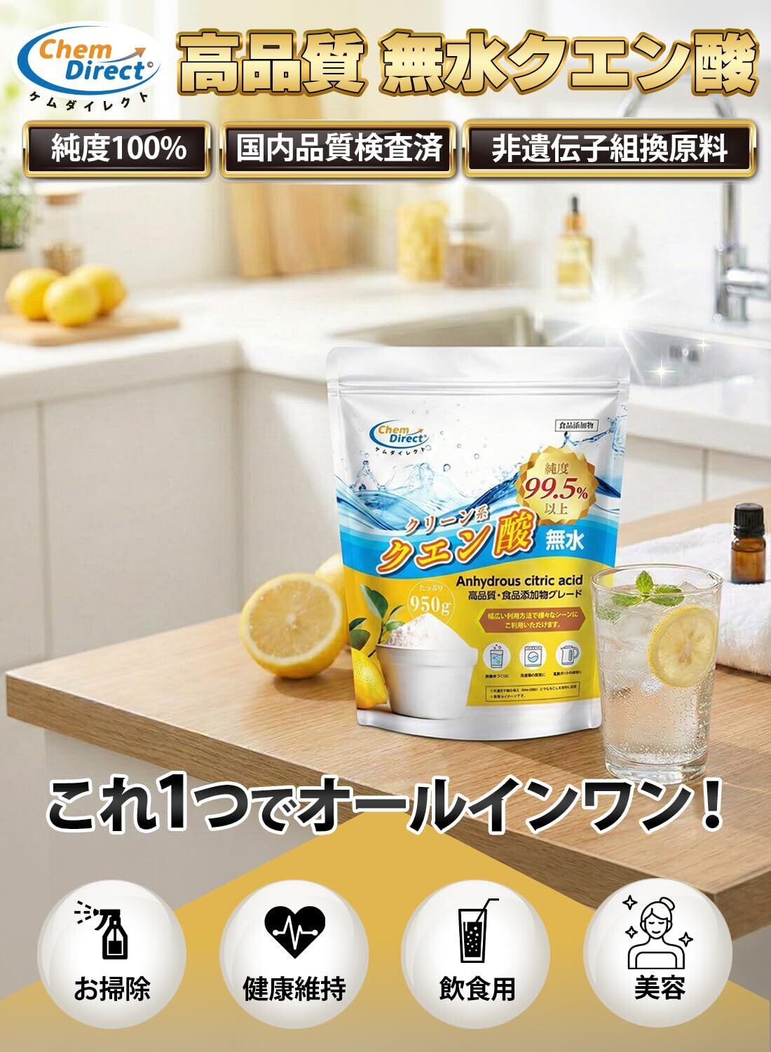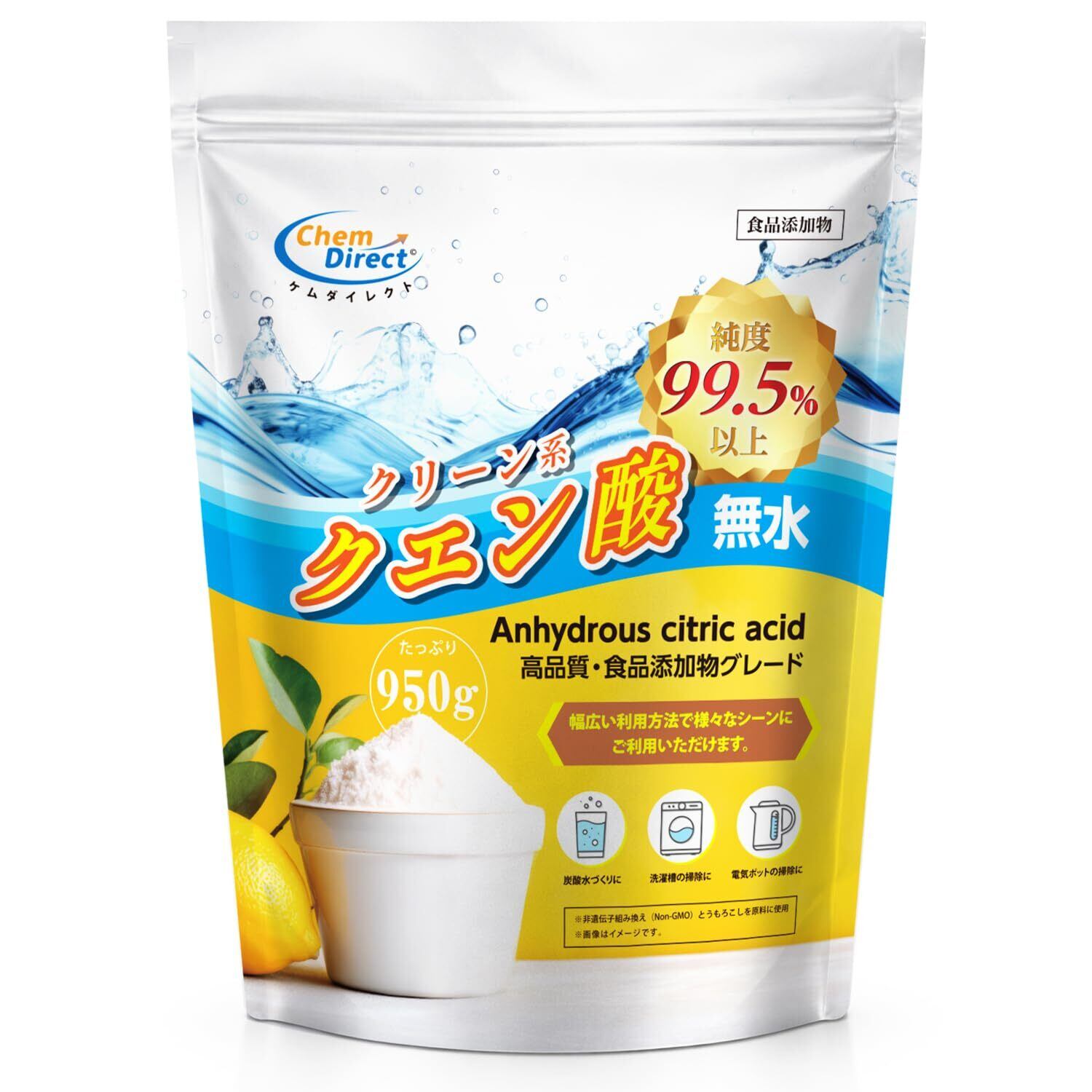 ChemDirect クエン酸 食用 掃除 洗剤 非遺伝子組換え 疲労回復 洗浄効果 美容効果 食品添加物 自立式 粉末 洗濯 掃除用 食用クエン酸 無水 サプリ 消臭 (950g × 1袋)