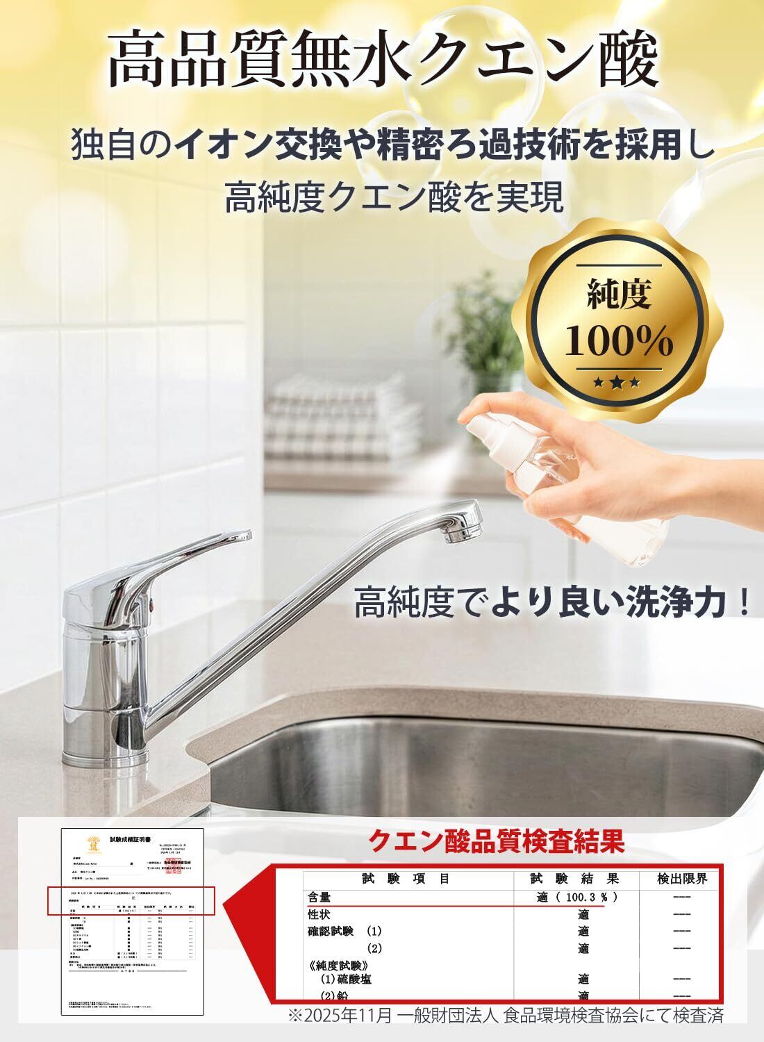 【主要規格(FCC / USP / BP / E330)に適合】 FCC(食品)、USP(米国薬局方)、BP(英国薬局方)、E330(欧州の食品添加物規格)など、主要な基準に適合した仕様です。食品用途から幅広い用途まで、規格面での汎用性があります。
