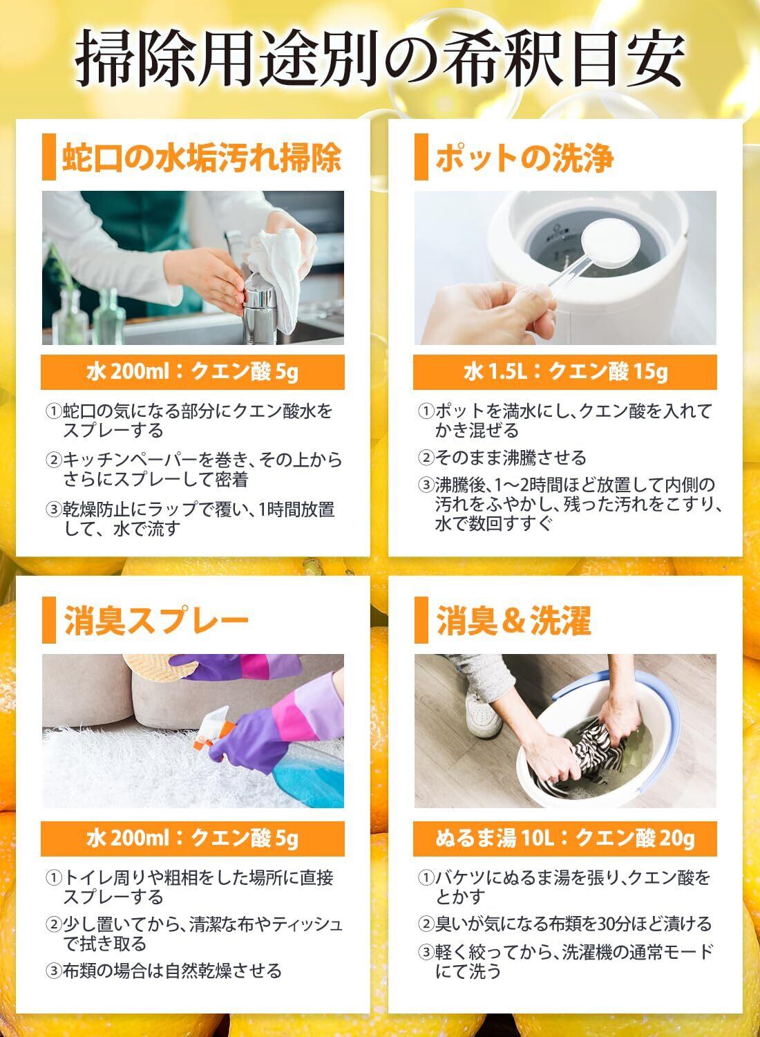 【食品・飲料から洗浄、化粧品原料まで幅広く対応】 食品添加物用途(酸味料、pH調整等)をはじめ、洗浄用途や化粧品原料、工業用途など、さまざまなシーンでご使用いただけます。用途に応じた使用方法・使用量を守ってご利用ください。