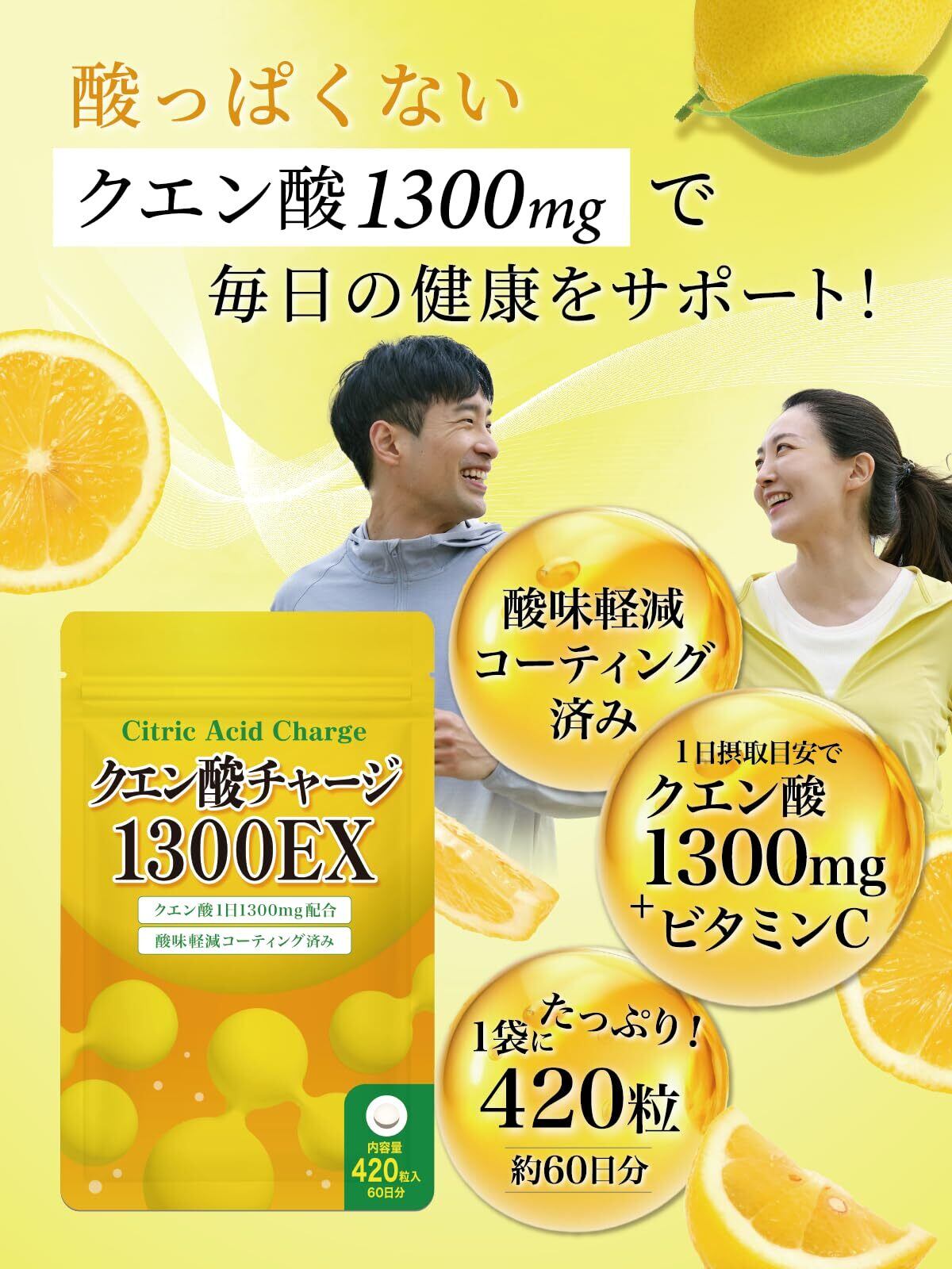 プライム製薬 クエン酸 60日分 サプリ 歯を痛めない 1300mg 飲みやすいクエン酸 酸味軽減 コーティング ビタミンC 1300EX 錠剤