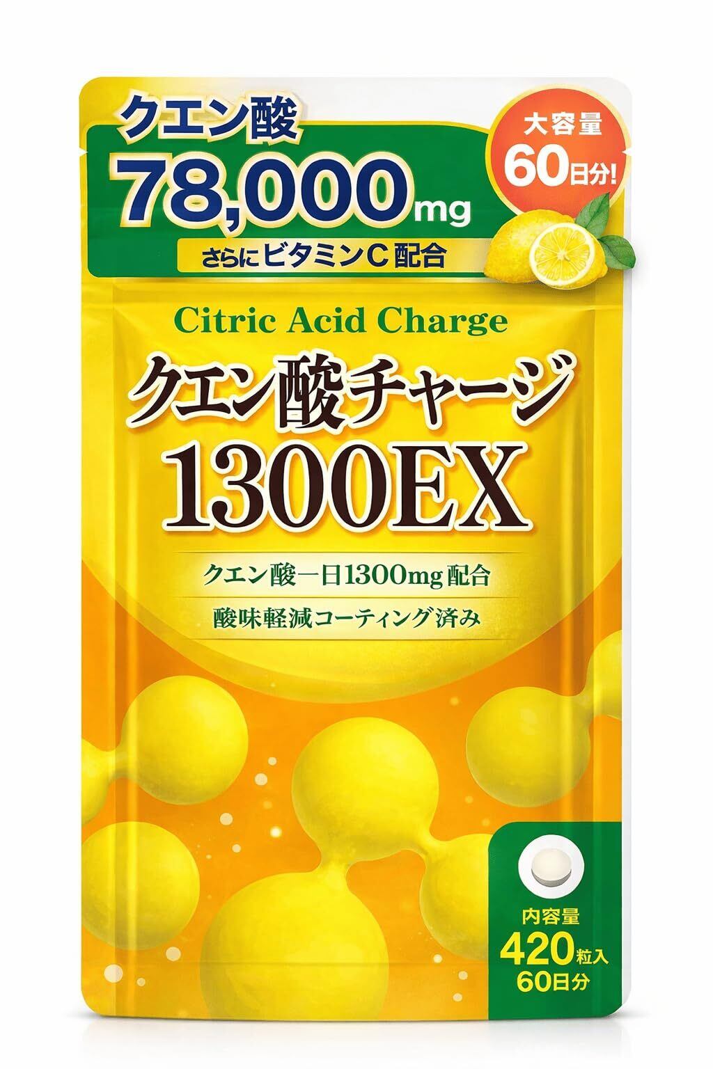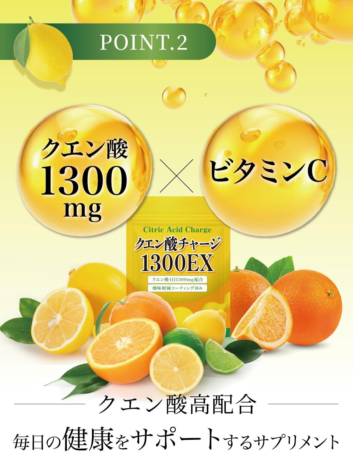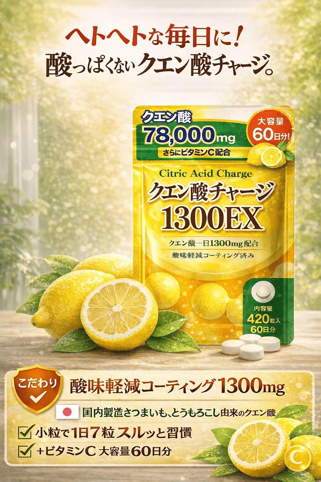 【1日あたりクエン酸1300mg配合】1日7粒でしっかりクエン酸1300mgを摂取可能。さらにビタミンCも配合し、美容と健康をトータルサポートします。