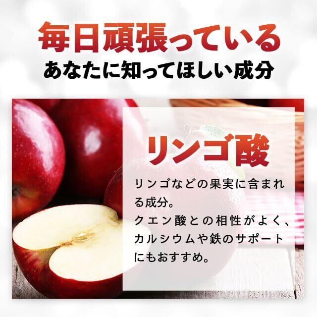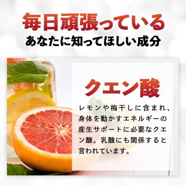 【嬉しいプラス成分】 元気サポートに最適なクエン酸に加え、カルシウムや鉄の吸収を助けるリンゴ酸もプラス。 さらに、食事で摂取した栄養をエネルギーに変えるB1、B2、B6も配合し、持久力アップをサポートします。