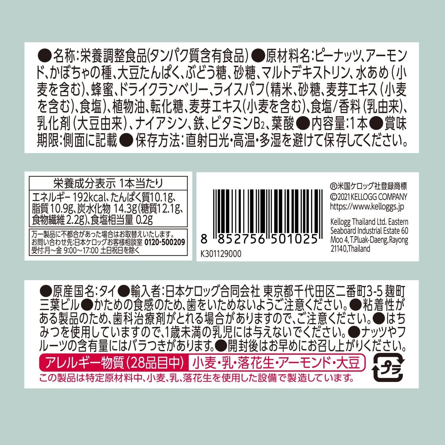 ピーナッツ、アーモンド、かぼちゃの種、大豆たんぱく、ぶどう糖、砂糖、マルトデキストリン、水あめ(小麦を含む)、蜂蜜、ドライクランベリー、ライスパフ(精米、砂糖、麦芽エキス(小麦を含む)、食塩)、植物油、転化糖、麦芽エキス(小麦を含む)、食塩/香料(乳由来)、乳化剤(大豆由来)、ナイアシン、鉄、ビタミンB2、葉酸