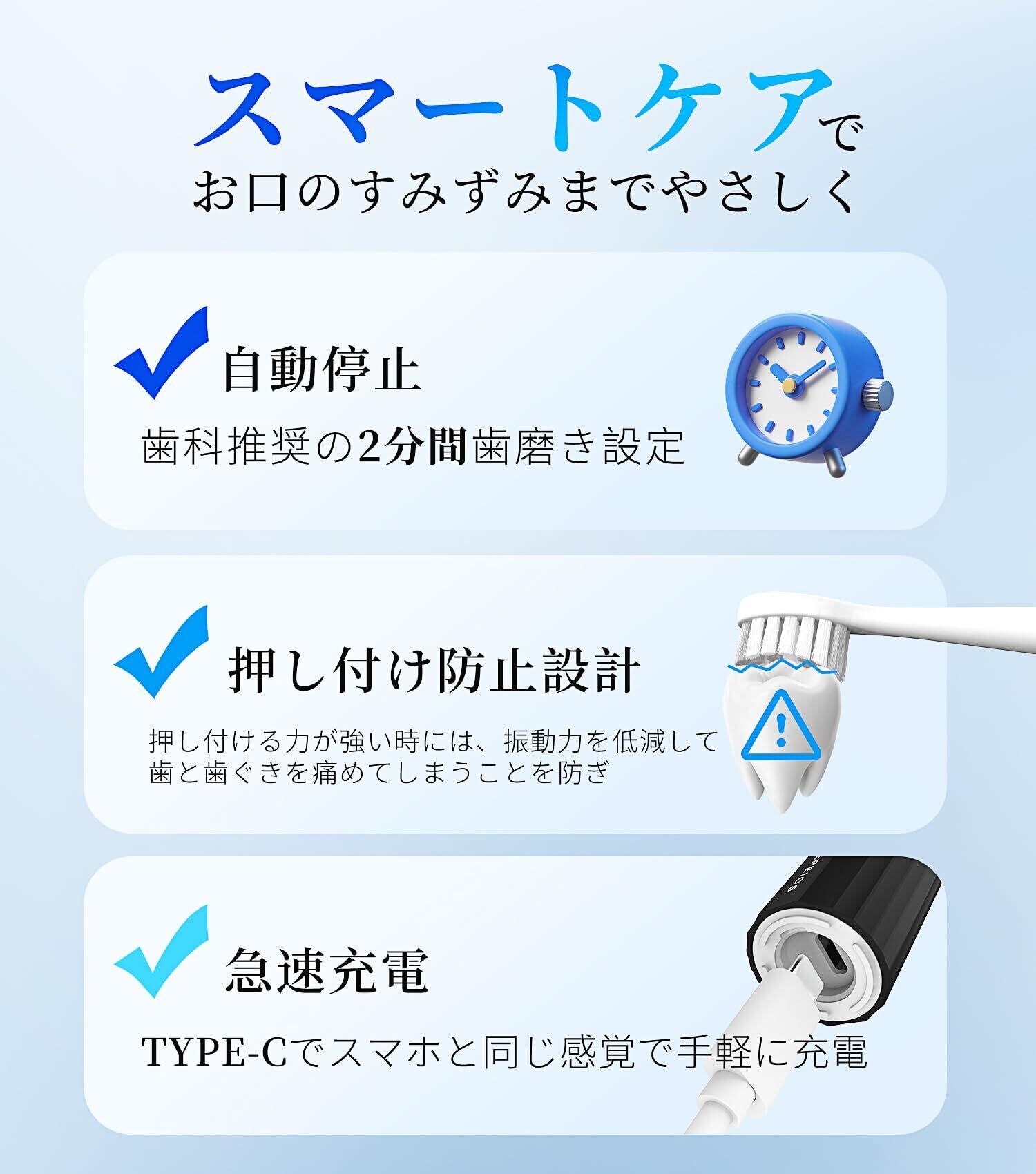 【日本企画安心サポート】本製品のお買い上げ日より1年間の期間がついております。商品の不良や要望・質問などがございましたら、いつでもお気軽にお問合せください。【素敵なセット内容】電動歯ブラシ本体x1(ブラシヘッドは含みません)、通常の替えブラシx2、保護カバーx2、充電ケーブルx1、取扱説明書x1。 ※ 該当商品の替えブラシは他社品では適用できないため、ご注意ください。