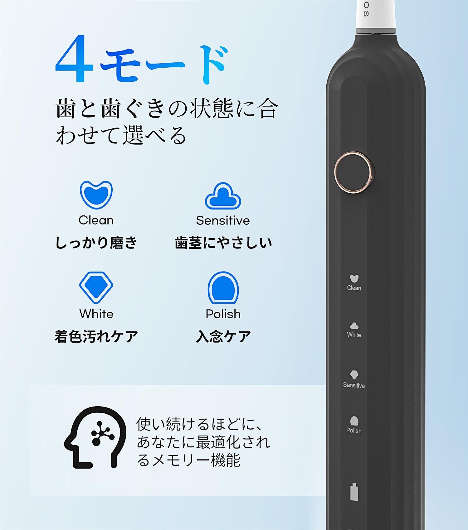 【4つのブラッシングモード ・2分間スマートタイマー ・ 過圧防止センサー機能】音波歯ブラシは4段階の切替モード(クリーニング/センシティブ/ホワイト/ポリッシング)で振動速度を変え、「2分間」で自動停止機能付き(ホワイトモードでは2分30秒で自動停止)、電動歯ブラシにかけられた圧力が大きすぎると、自動的に振動を低減し、歯と歯茎を強すぎる刺激から守ります。