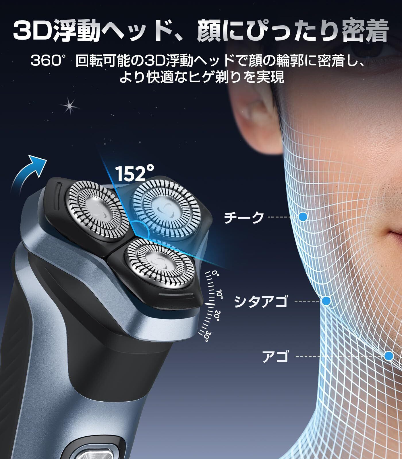 ひげそり 電動シェーバー メンズ 3D磁気式浮動ヘッド 54枚刃 深剃り 電気シェーバー (回転式·お風呂剃り·丸洗い可)自動研磨システム 乾湿両用 ヒゲトリマー付き IPX7防水 急速充電 360分連続使用 持ち運び便利 出張 旅行 父の日ギフト