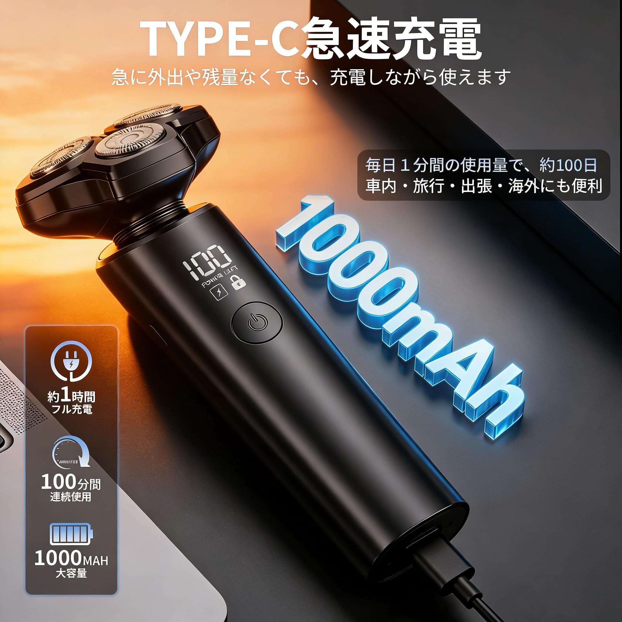 【Type-C 急速充電 & 長時間駆動】 ひげそり 電動シェーバーは汎用性の高いType-C充電ポートを採用。大容量1000mAhにより、わずか1.5時間でフル充電が完了し、約100分間(約60日分)の連続使用が可能です。100-240Vの海外対応電圧で、出張や旅行先でも安心してご使用いただけます。