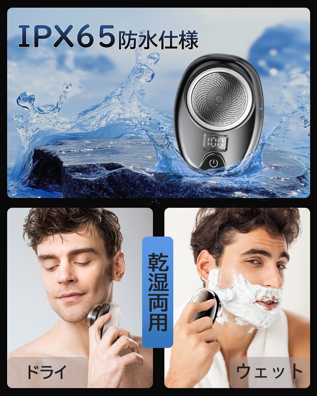 【IPX65防水設計】IPX6の防水性能を備えた超小型シェーバー本体、ウェットでもドライでも剃れる、お手入れ簡単、刃の部分に毛クズや皮脂汚れは水で洗い流せる、後片付けも手軽にできます注:内蔵バッテリーの保護のため、充電ポートを水に浸さないようご注意ください。