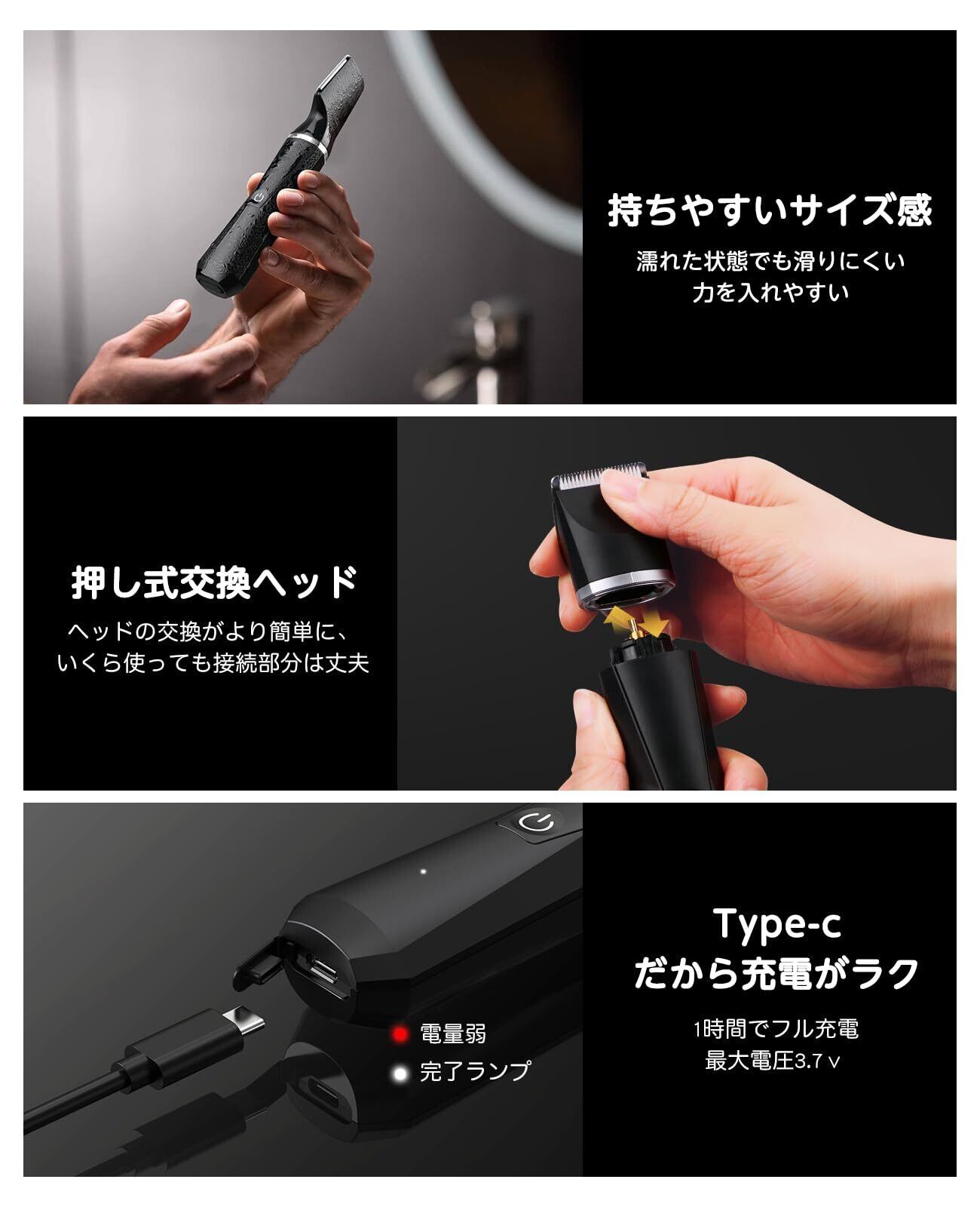 特徴 交換可能なトリマーヘッド, 低刺激性, 水洗い可能, 軽量, 高速充電