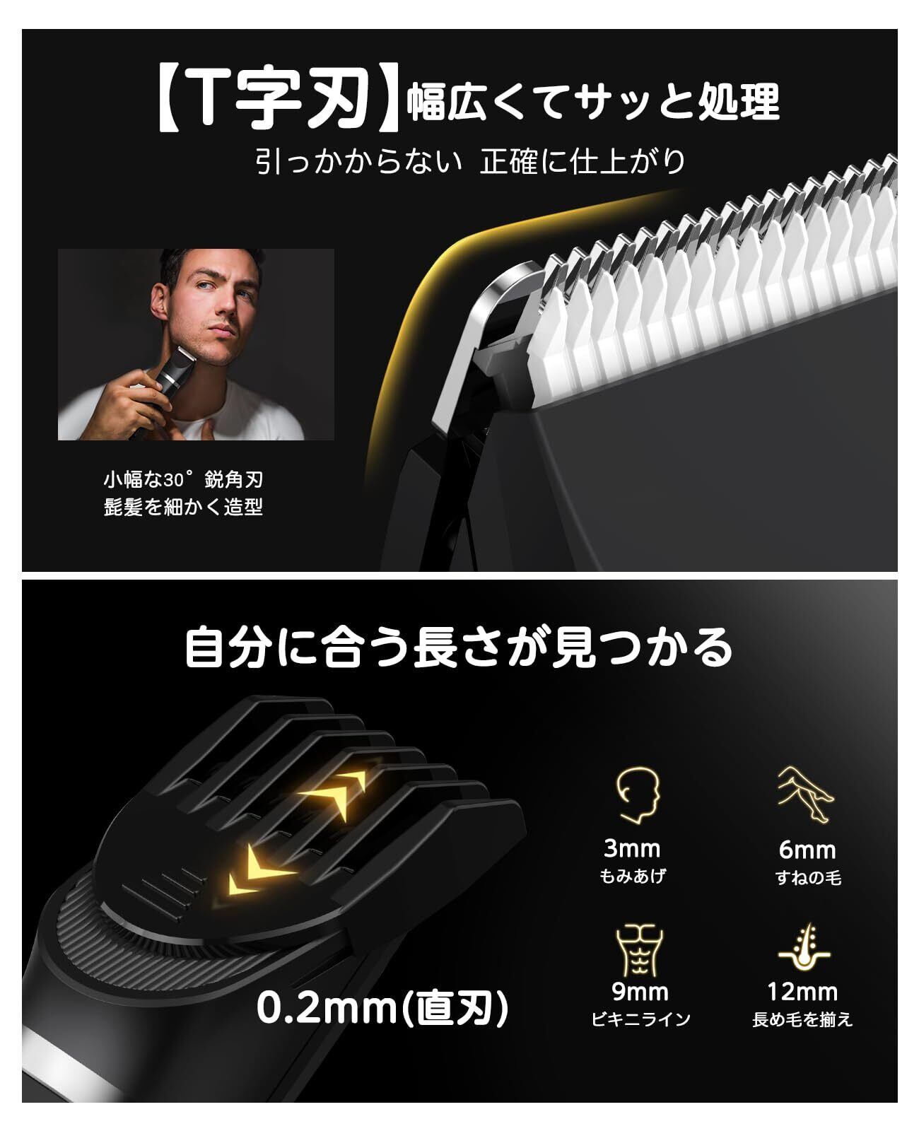 【広範囲むだげ処理・長さ調節T字刃】幅広の「T字」ヘッドは少ない回数で毛を素早く剃れ、毛の濃くて長い方でも、ストレスなく使い続けやすい。3mm/6mm/9mm/12mm長さ調整が可能なアタッチメントが揃っており、バリカンのようにもみあげ、えりあし、あごヒゲなど思い通りにカット。剃りだけでなく、初心者でも楽々と理想の体毛整えを実現できます。