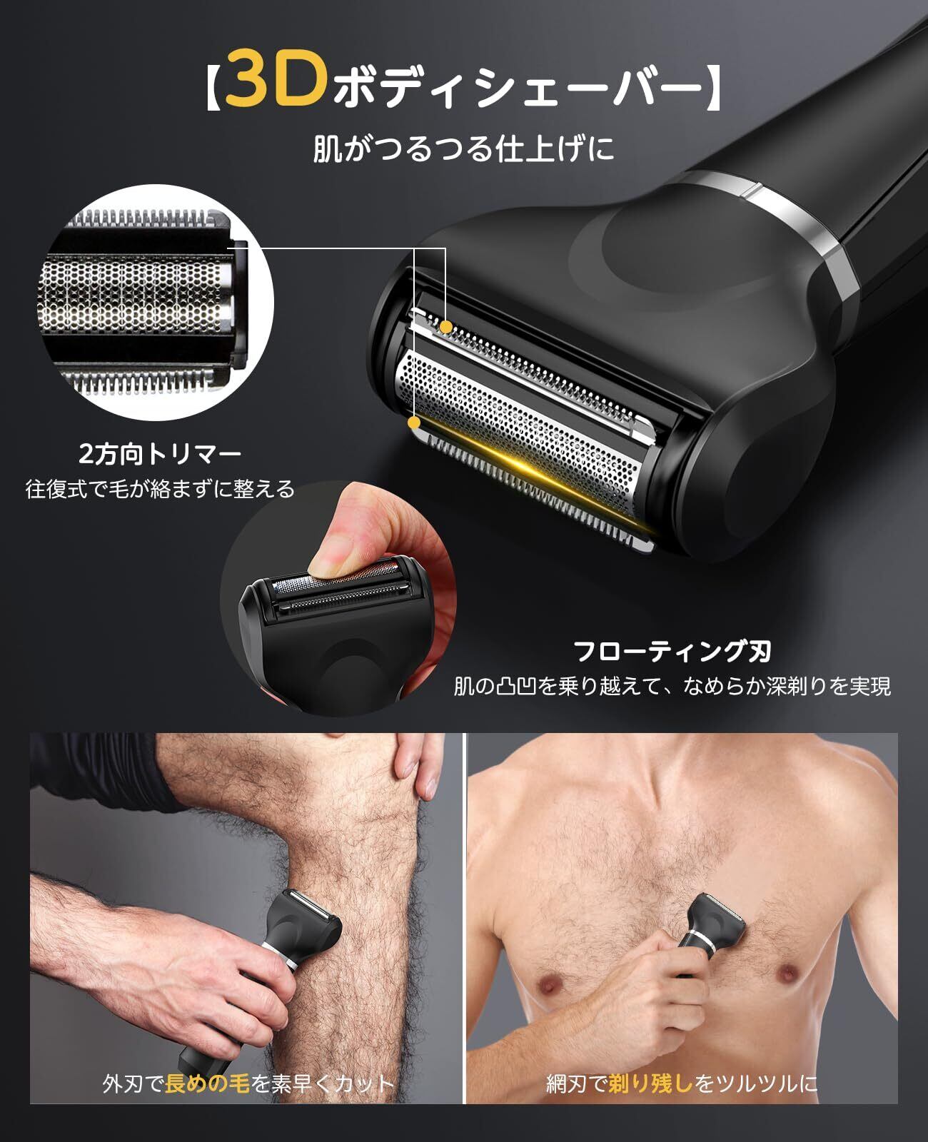 【すべすべ肌へ・3Dボディーシェーバー】肌に直接触れなく、双方向前後どちらにもトリミングできる設計で、肌へのダメージを最小限に抑えながら、毛の長さ・タイプに左右されずに処理。丸みを帯びた直刃で長い毛をやさしくカット、ネットヘッドは微妙な凹凸な輪郭にフィットし、つるつるまで仕上げ。すね毛・腋毛・胸毛・腕毛・腹毛・ふとももの毛からVIOなどのアンダーヘアーまで、全身の無駄毛に最適なボディグルーマー。