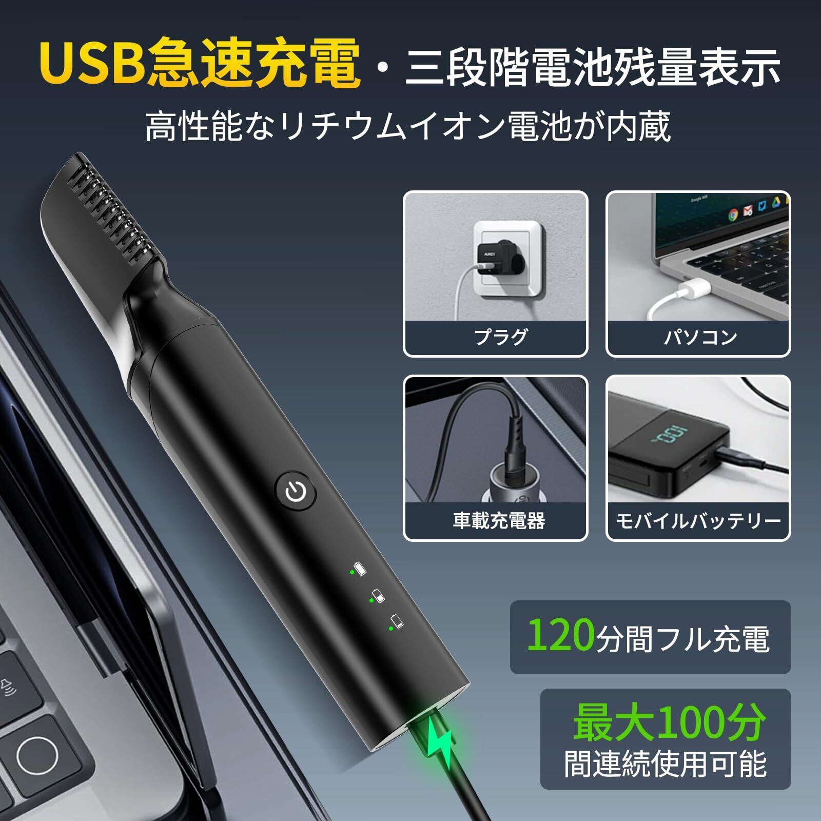 特徴 IPX7防水 乾湿両用 自動研磨機能 15段階調整可 1~17mm長さ対応 低騒音 バッテリー表示 USB充電 全身カット可能 油汚れ防止 軽量設計