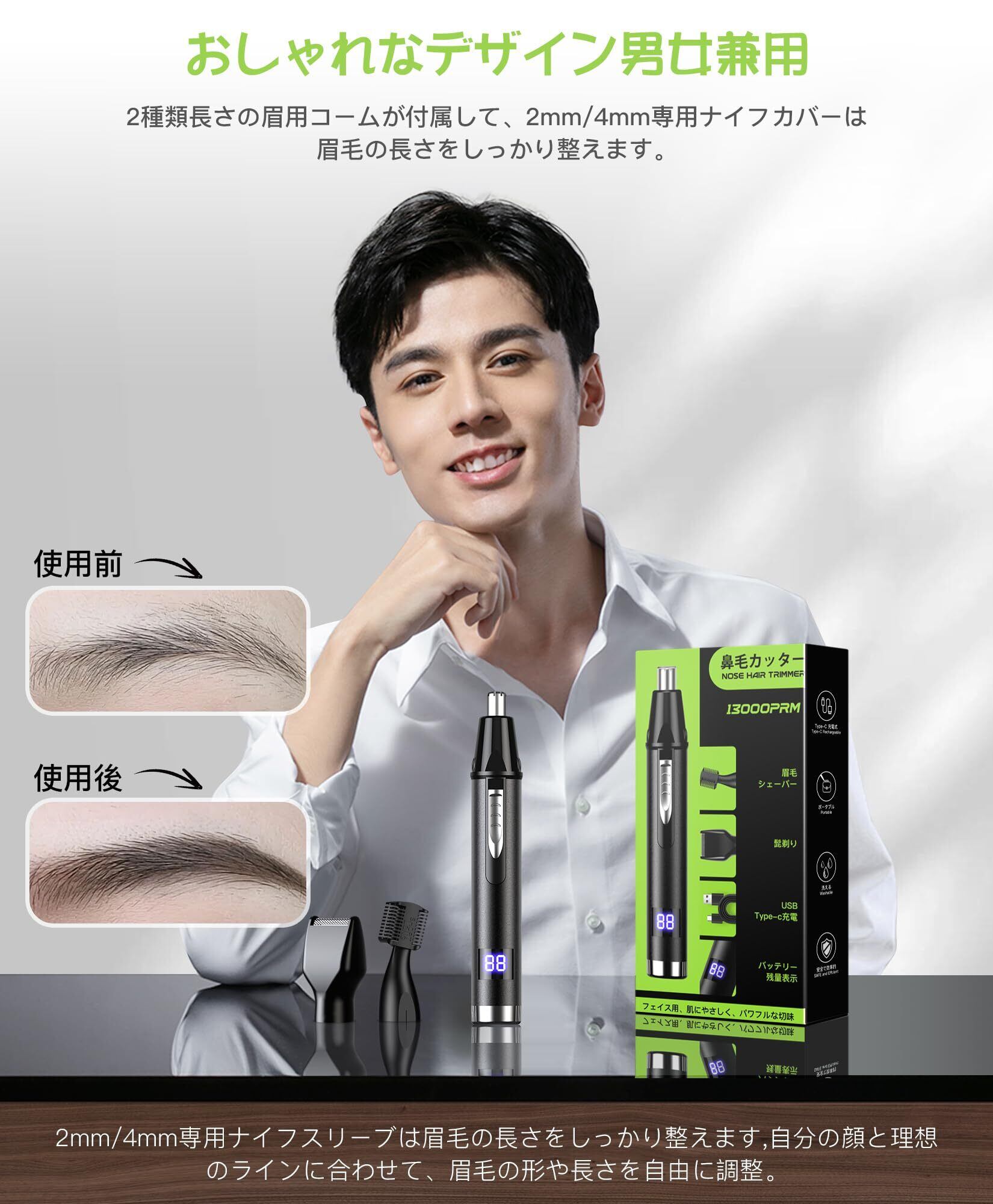 「LCDバッテリー画面・多機能電動鼻毛カッター」デジタルLCDスクリーンを搭載したので、いつでも電力残量を把握することができます。途中で停電するが心配なく、使用体験をアップします。この3in1耳毛カッターは値段安く使い便利で、鼻毛、耳毛、眉毛、ひげ、髭、揉み上げの余計な毛が悩んでいる問題を解決。眉毛剃りにはLCDバッテリー表示スクリーンが搭載されており、バッテリーフル充電時の充電量は00から99まで上がります。仕事でもデートでも自信満々の魅力ある自分が登場させる。