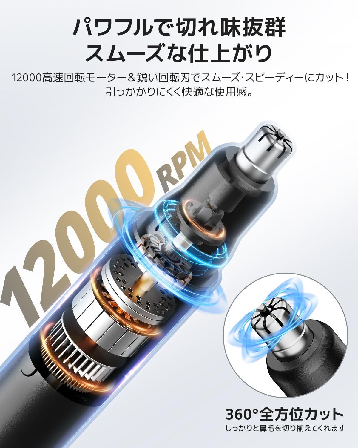 ✨【一台多役・高速360°回転】この 鼻毛カッター は、鼻毛だけでなく、耳毛、眉毛、ひげのトリミングにも対応する多機能設計です。12000RPMのエチケットカッター 高速モーター駆動を搭載しております。360°全方向回転する高精度の刃が搭載されており、どの角度からでも効率よく毛をカットできます。高速回転でスムーズに動作し、わずかな時間で清潔な仕上がりを実現します。特にデリケートな部分の処理においても、引っかかりや痛みを感じさせない滑らかな操作感が特徴です。これ一台で多様なニーズに応えるため、日常のケアがより簡単に行えます。