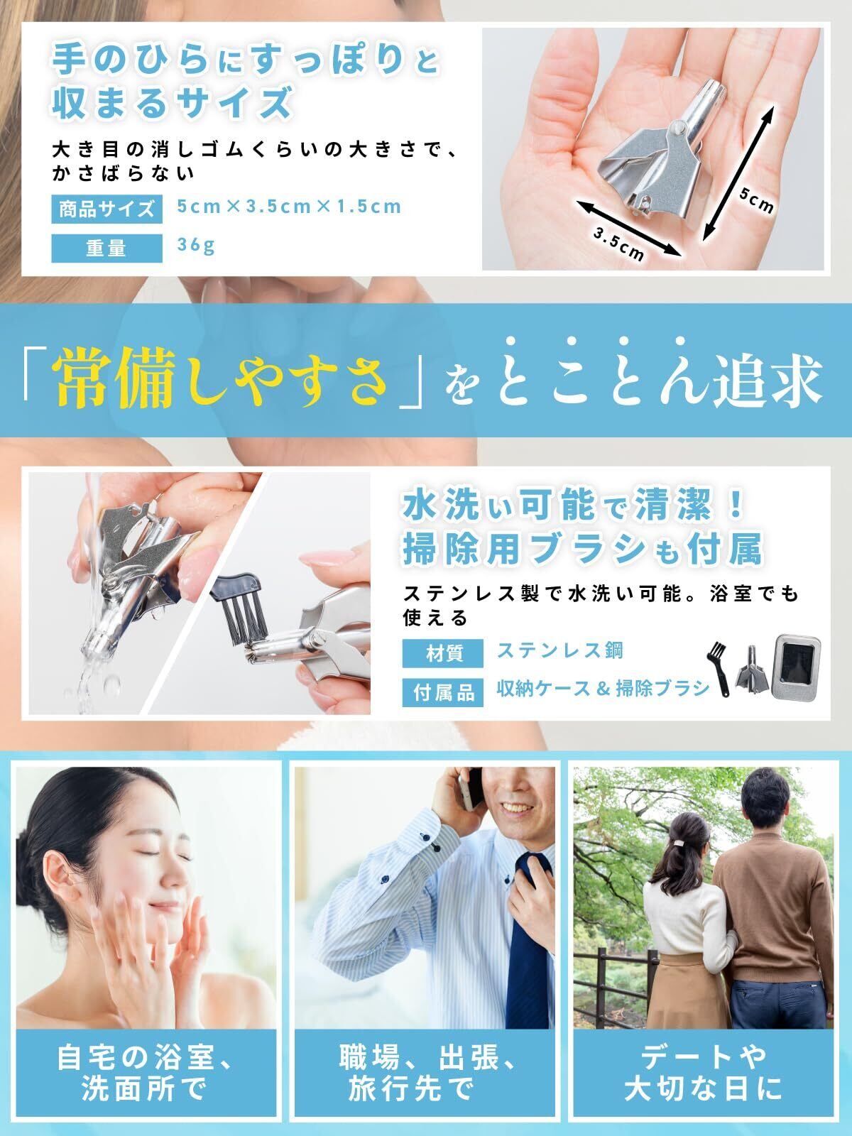 【安全性】 鋭利な刃先を安全にガードする設計で、肌に優しく鼻の内部を傷つける心配がありません。使い方も簡単で、初心者でも安心してお使いいただけます。 【耐久性】 高品質のステンレススチール製なので丸洗いでき、使用後は洗浄ブラシで掃除し、水で洗うだけで錆びません。頻繁に使用しても性能が落ちることなく、長期間にわたり清潔に保てます。