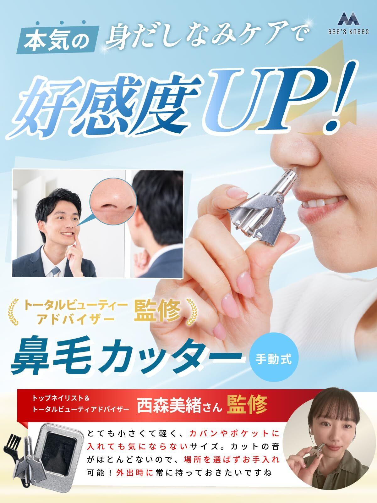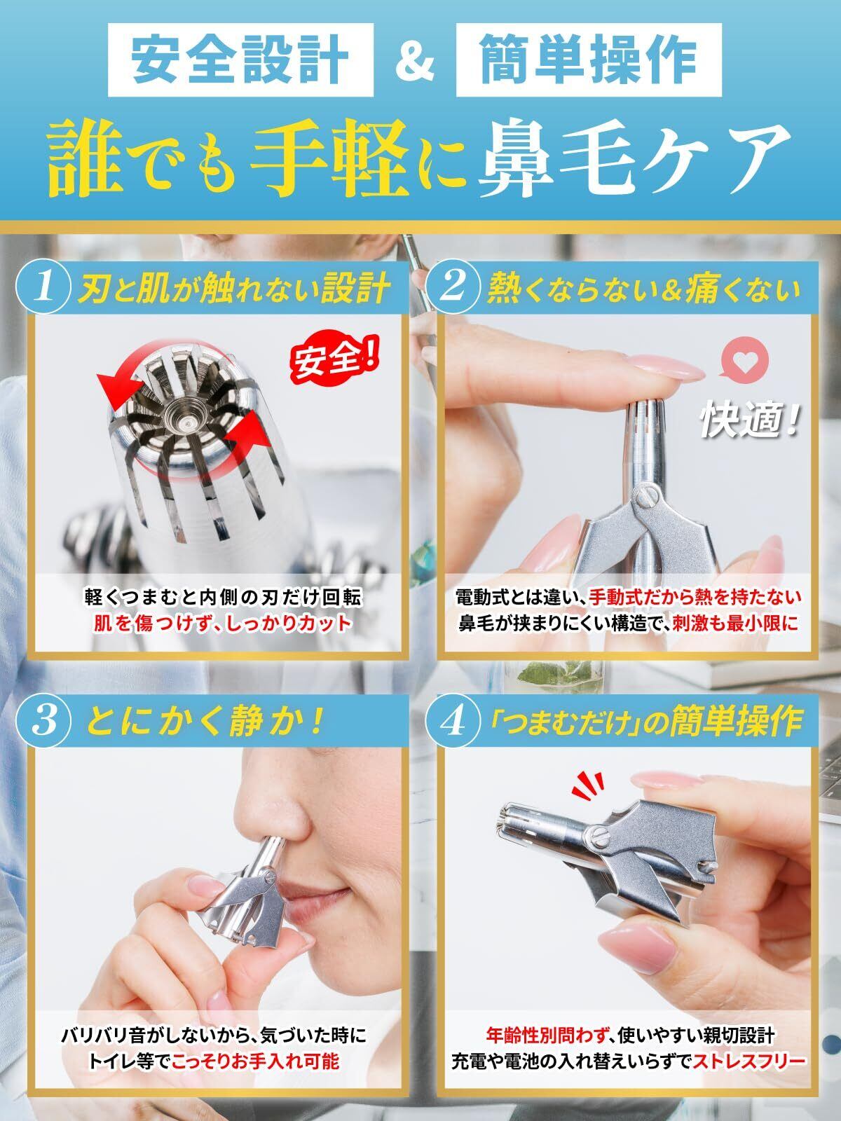手動式鼻毛カッター 完璧な身だしなみを手に入れるための究極のツール 手動式鼻毛カッターは、簡単で効果的に鼻毛をトリミングできる、信頼性の高い美容アイテムです。 シンプルな設計と高品質の素材を使用して、どなたでも手軽にご利用いただけます。 具体的なメリット 【使いやすさ】 手動式のため、電池や電源が不要で、いつでもどこでも使用可能です。軽量でコンパクトなデザインなので、旅行や出張にも最適です。