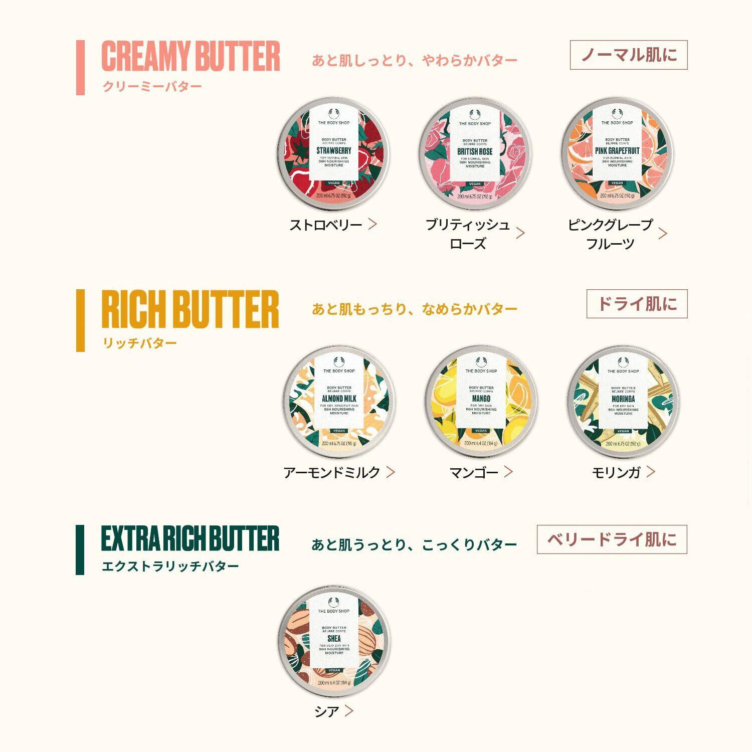 96%自然由来成分配合で、クリーミーで常温バターのようにとろけて肌に伸び、うるおうのにべたつかないテクスチャーの、イングリッシュローズエキス(整肌成分)を配合したボディクリームです。