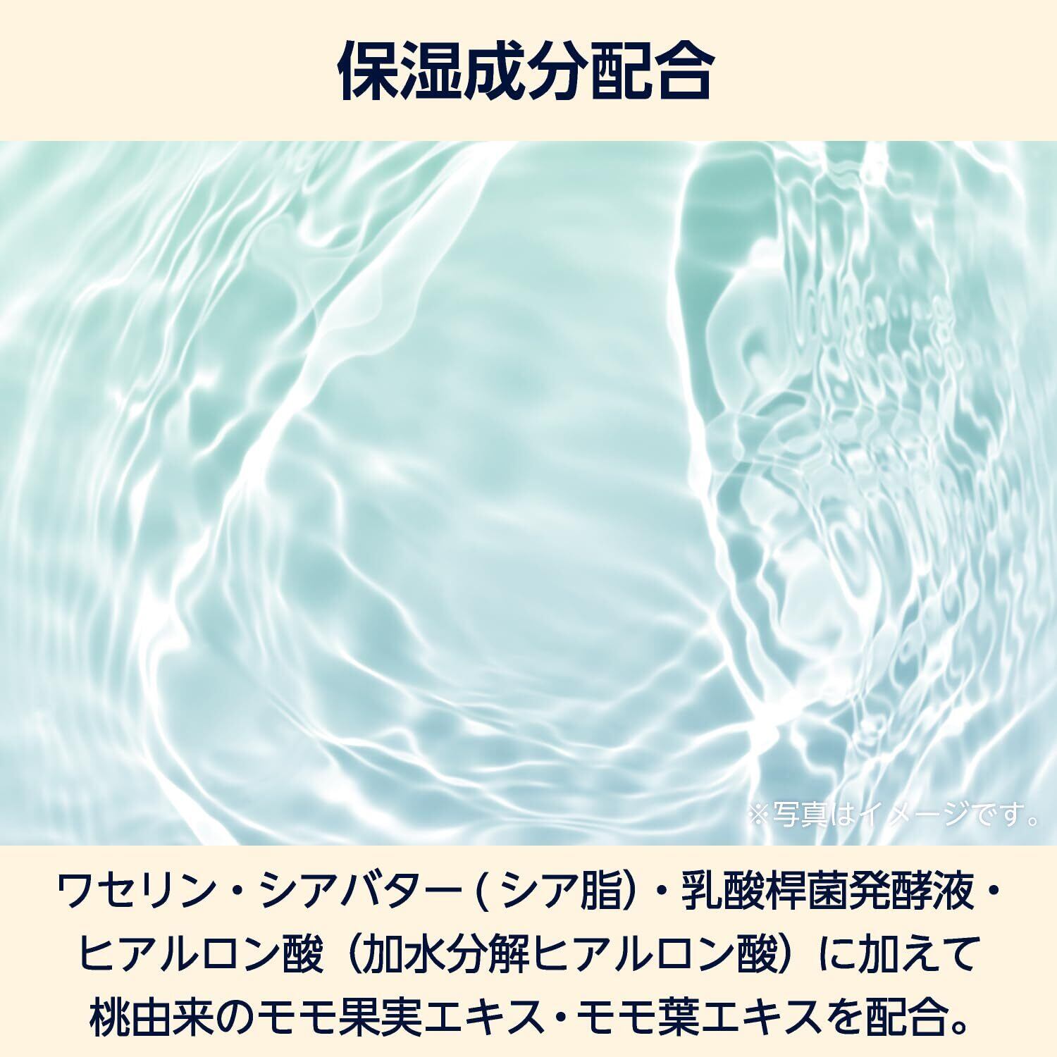 ワセリン・シアバター(シア脂)・乳酸桿菌発酵液・ヒアルロン酸(加水分解ヒアルロン酸)に加えて桃由来のモモ果実エキス・モモ葉エキスを配合ししっかり保湿。(※すべて保湿成分)