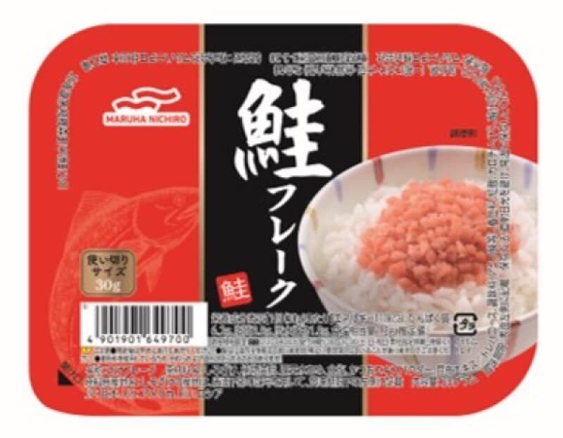 原材料:しろざけ、植物油脂、還元水あめ、食塩、かつおエキスパウダー、昆布エキス/トレハロース、調味料(アミノ酸等)、着色料(紅麹、カロチノイド)、酸化防止剤(V.E)、乳化剤、(一部にさけ・大豆・魚醤(魚介類)を含む)