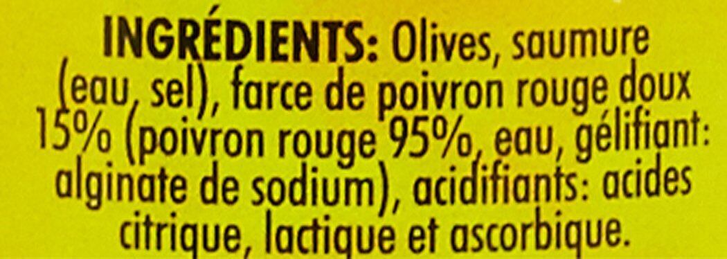 オリーブ、赤ピメントペースト、食塩/増粘剤(アルギン酸ナトリウム、グァーガム)、pH調整剤、酸化防止剤(V.C)