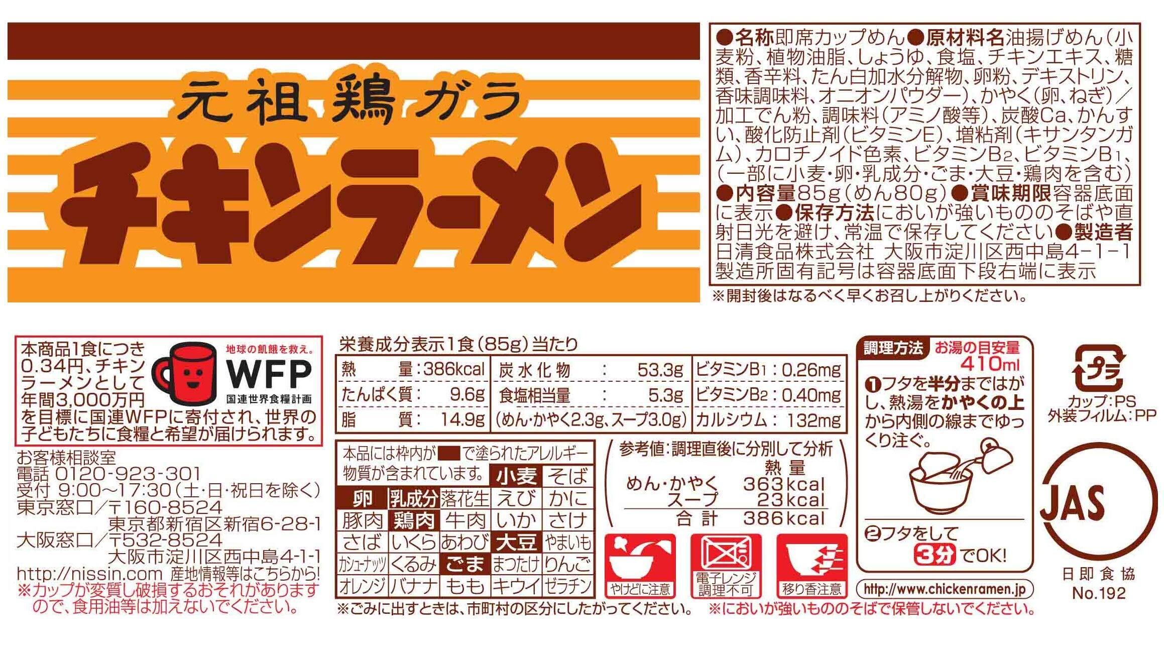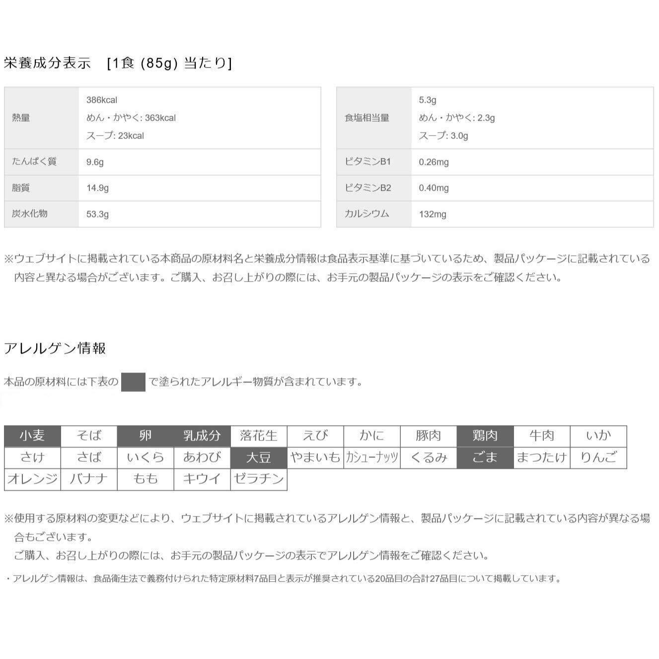 油揚げめん(小麦粉、植物油脂、しょうゆ、食塩、チキンエキス、糖類、香辛料、たん白加水分解物、卵粉、デキストリン、香味調味料、オニオンパウダー)、かやく(卵、ねぎ)/加工でん粉、調味料(アミノ酸等)、炭酸Ca、かんすい、酸化防止剤(ビタミンE)、増粘剤(キサンタンガム)、カロチノイド色素、ビタミンB2、ビタミンB1、(一部に小麦・卵・乳成分・ごま・大豆・鶏肉を含む)