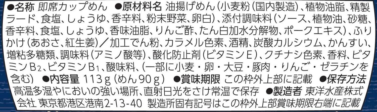 油揚げめん(小麦粉(国内製造)、植物油脂、精製ラード、食塩、しょうゆ、香辛料、粉末野菜、卵白)、添付調味料(ソース、植物油、砂糖、香辛料、食塩、しょうゆ、香味油脂、りんご酢、たん白加水分解物、ポークエキス)、ふりかけ(あおさ、紅生姜)/加工でん粉、カラメル色素、酒精、炭酸カルシウム、かんすい、増粘多糖類、調味料(アミノ酸等)、酸化防止剤(ビタミンE)、クチナシ色素、香料、ビタミンB2、ビタミンB1、酸味料、(一部に小麦・卵・大豆・豚肉・りんご・ゼラチンを含む)