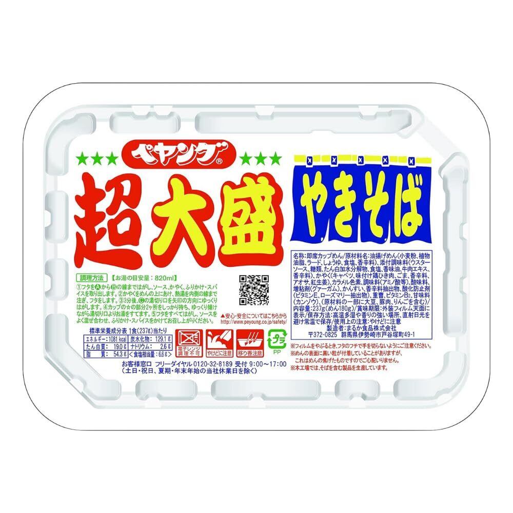 ペヤング ソースやきそばを2倍にボリュームUPしました。 1食で満腹感がしっかり感じられる商品です。 原材料名 油揚げめん(小麦粉、植物油脂、ラード、しょうゆ、食塩、香辛料)、添付調味料(ウスターソース、糖類、たん白加水分解物、食塩、香味油、牛肉エキス、香辛料)、かやく(キャベツ、味付け鶏ひき肉、ごま、香辛料、アオサ、紅生姜)、カラメル色素、調味料(アミノ酸等)、酸味料、増粘剤(グァーガム)、かんすい、香辛料抽出物、酸化防止剤(ビタミンE、ローズマリー抽出物)、重曹、ビタミンB₂、甘味料(カンゾウ) 主要栄養成分表1食(237g)当たり エネルギー 1081kcal ナトリウム 2.6g たん白質 19.0g 脂質 54.3g 炭水化物 129.1g