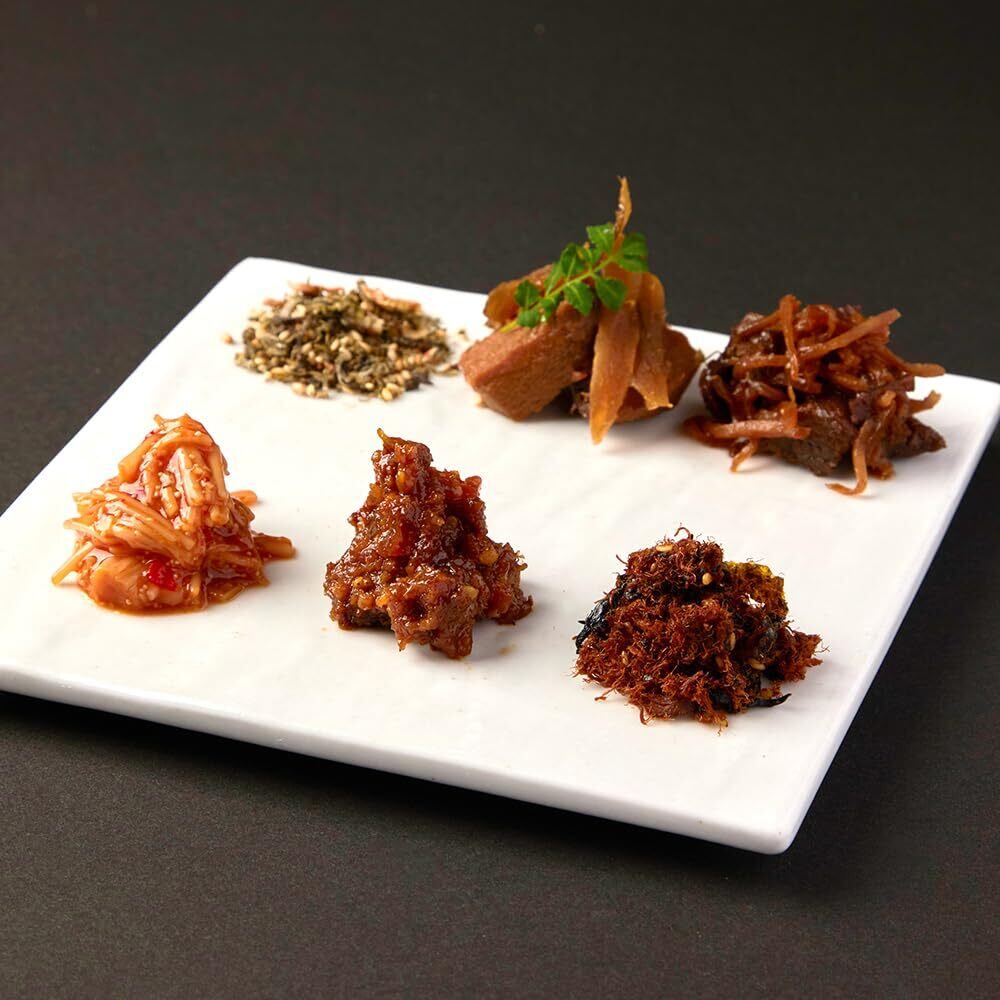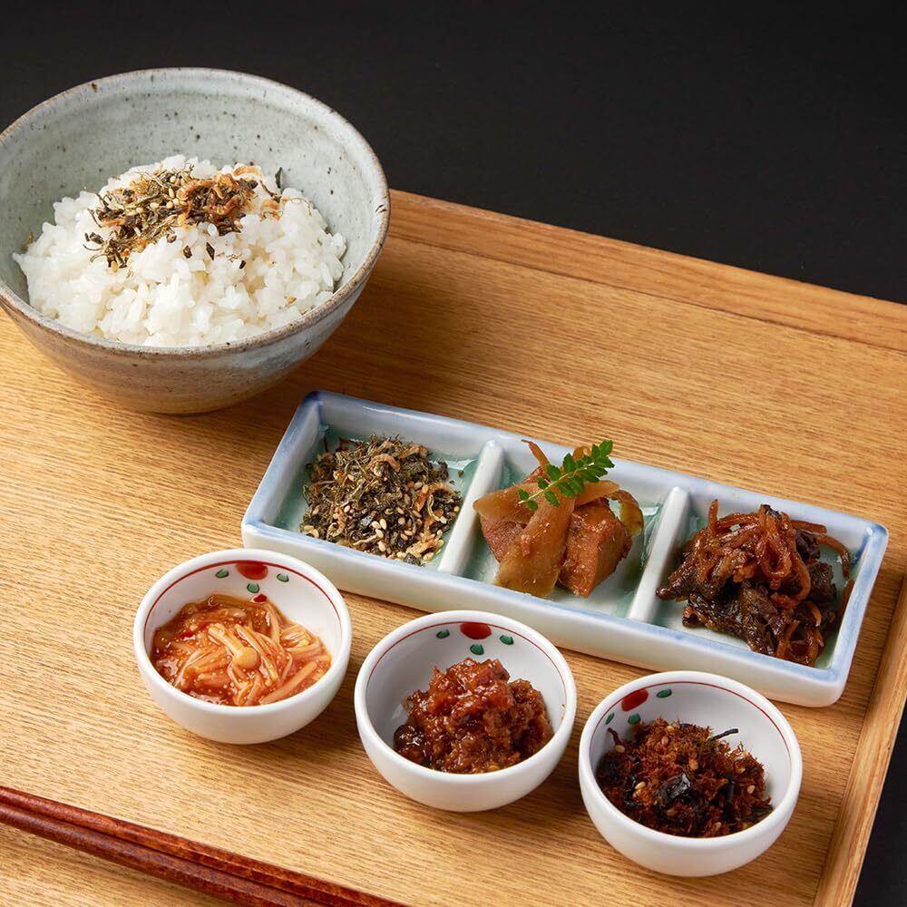 ◆昆布ふりかけ:昆布(北海道産)(がごめ昆布20%)、ごま、干しあみえび(ツノナシオキアミ)、山椒、醤油、醸造酢、食塩/ソルビット、調味料(アミノ酸)、甘味料(甘草)、酸味料、(一部に小麦・大豆・ごまを含む)※本製品で使用しているオキアミは、えび・かにが混ざる漁法で採取しています。 ◆きんぴらまぐろ: まぐろ(国産)、砂糖、醤油、ごぼう、還元水飴、水飴、塩こうじ、生姜、清酒、寒天、(一部に小麦・大豆を含む) ◆京のぜいたく牛しぐれ:牛肉(国産)、料理酒、醤油、昆布だし、砂糖、生姜、醸造酢、たまり醤油、和風だし(混合ぶし、ブドウ糖果糖液糖、その他)、水飴、酵母エキス/調味料(アミノ酸等)、酸味料、糊料(増粘多糖類)、甘味料(甘草)、着色料(カラメル)、(一部に小麦・牛肉・さば・大豆・りんごを含む) ◆明太子なめ茸:えのき茸(国産)、キムチ味液(食塩、ガーリック、その他)、辛子明太子、醤油、砂糖、醗酵調味料、醸造酢、ヤンニンジャン、昆布エキス、かつお節エキス、香辛料、寒天/調味料(アミノ酸等)、パプリカ色素、酸化防止剤(V.C)、酸味料、増粘多糖類、甘味料(ソルビット、ステビア)、ナイアシン、塩化Mg、発色剤(亜硝酸Na)、(一部に小麦・ごま・ゼラチン・大豆・りんごを含む)※まれに黒い破砕物がありますが、これは唐辛子の一部ですので、品質には問題ございません。 ◆京都ぽーくの豚味噌:麦味噌(国内製造)、豚肉、砂糖、ごぼう、ねぎ、ごま、植物油、にんにく、生姜/グリシン、(一部にごま・大豆・豚肉を含む) ◆焼き鯖ひじき:鯖(輸入)、ひじき、のり、砂糖、ごま、醤油、食塩、(一部に小麦・ごま・さば・大豆を含む)