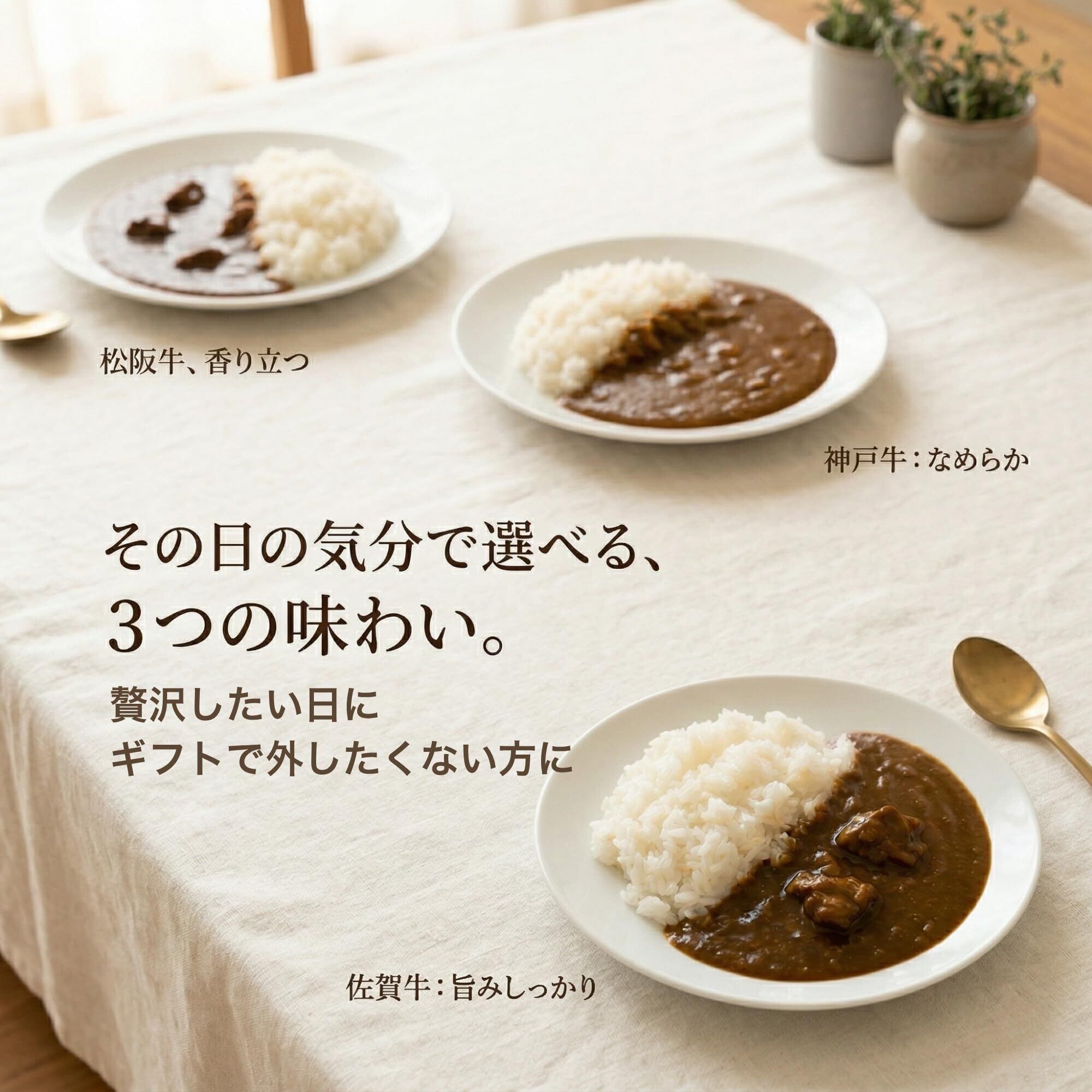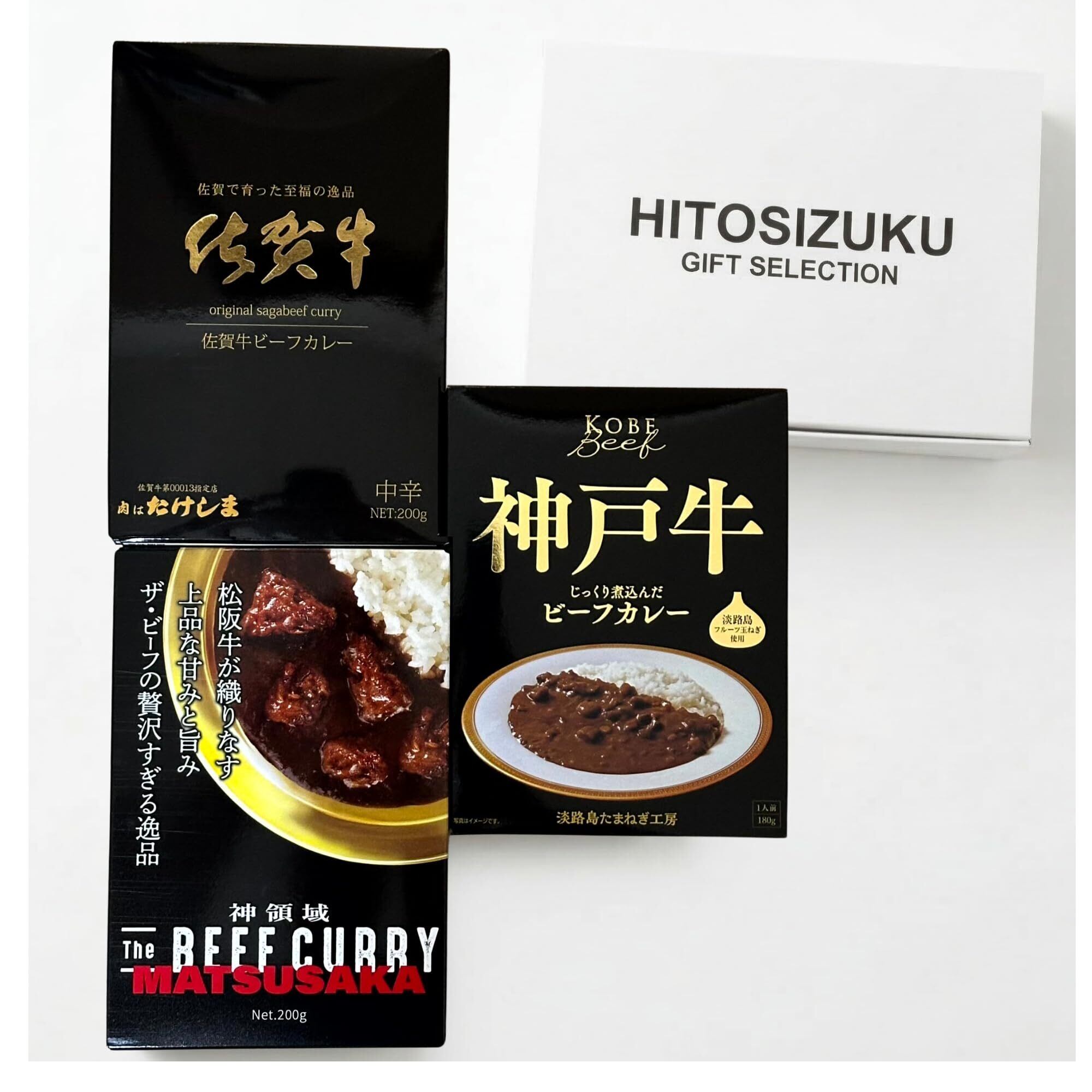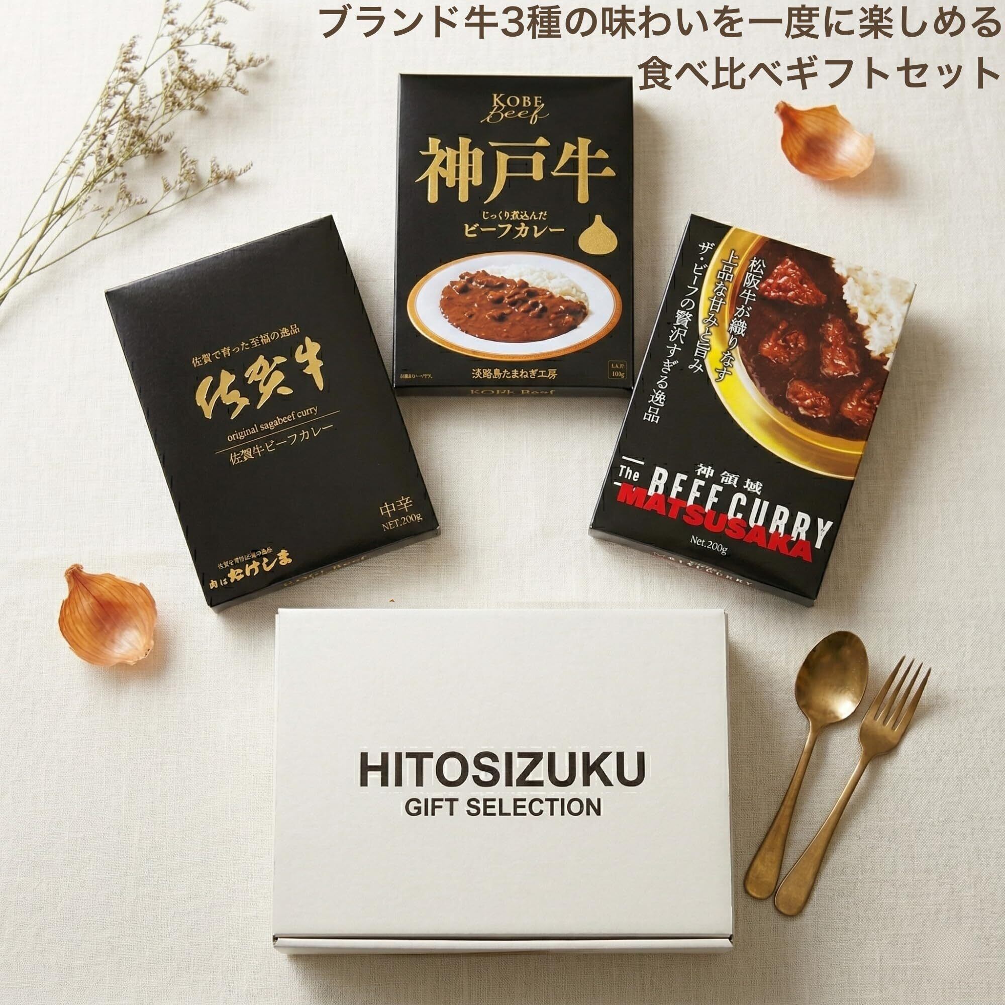 ブランド牛の味わいを一度に楽しめる、贅沢なカレー食べ比べギフトです。 松阪牛・佐賀牛・神戸牛、それぞれ異なる個性を持つ3種のブランド牛カレーを詰め合わせました。 スパイスの香りが際立つ本格派の「松阪牛カレー」、肉の旨味をしっかり感じる濃厚な「佐賀牛カレー」、コク深くまろやかな味わいの「神戸牛カレー」。 同じビーフカレーでも、それぞれ異なる美味しさを楽しめる“食べ比べセット”です。 どの味から試すか選ぶ楽しさも魅力です。 ご自宅でのちょっとした贅沢な食事にはもちろん、大切な方への贈り物や内祝い、お祝いにもおすすめです。 レトルトタイプで常温保存が可能なため、手軽に本格的な味わいをお楽しみいただけます。 HITOSIZUKUは、日本の良い食を届けるギフトブランドです。 特別なひとときを、ぜひお楽しみください。