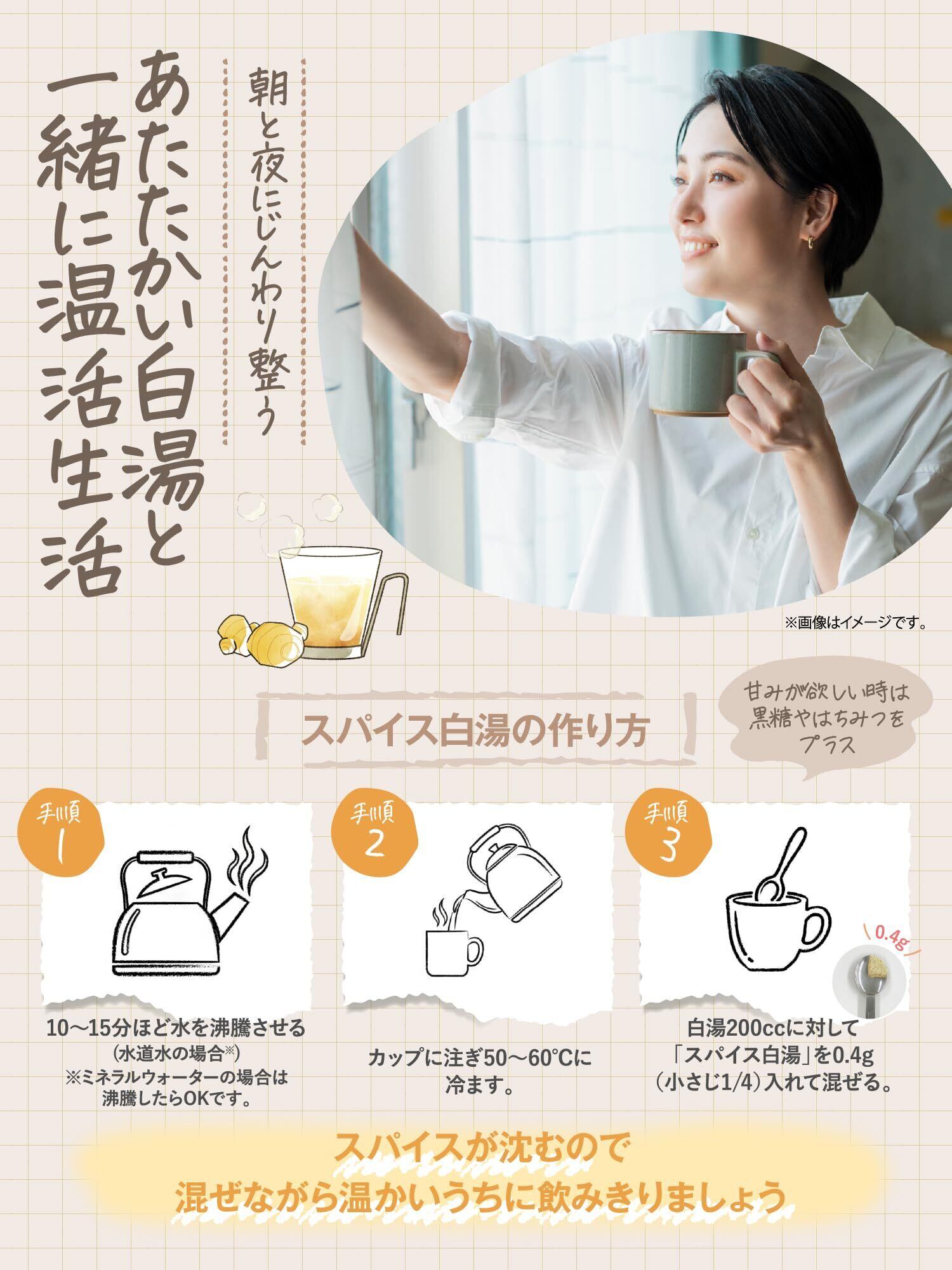 【スパイス白湯の作り方】沸騰後のお湯をカップに注ぎ、50~60℃に冷ます。その後、白湯200ccに対して本品0.4g(小さじ1/4)を入れて混ぜるだけ。スパイスが沈むので、混ぜながら温かいうちに飲み切りましょう。