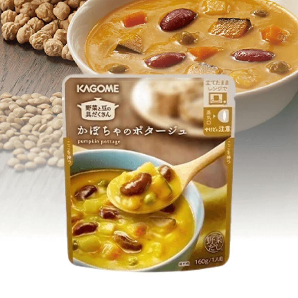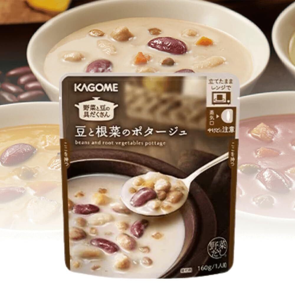 豆と根菜のポタージュ:白いんげん豆(アルゼンチン又はエジプト)、牛乳、ひよこ豆、いんげん豆、野菜(にんじん、たまねぎ)、ご ぼうピューレー、赤いんげん豆、レンズ豆、野菜だし、チキンブイヨン、油脂調整粉末、しょうゆ、かつお節エ キス、食用植物油脂、でん粉、米みそ、食塩、乾しいたけ、だいこんエキス、香辛料、(一部に小麦・乳成分・ 大豆・鶏肉を含む)