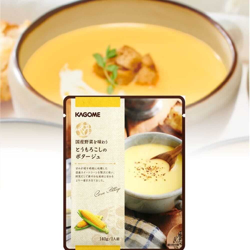 とうもろこしのポタージュ:とうもろこしピューレー(とうもろこし(国産))、牛乳、砂糖、油脂調整粉末、食塩、バター、野菜だし、( 一部に乳成分を含む)