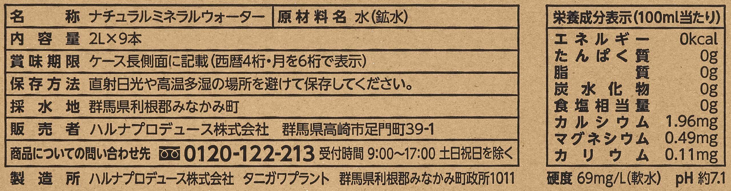 ・ナチュラルミネラルウォーター ・5年保存可能 ・ご購入後、賞味期限から5年以上残るようにお届けいたします。 原材料・成分 原材料:水(鉱水) 栄養成分(100ml当たり):エネルギー0kcal、たんぱく質0g、脂質0g、炭水化物0g、食塩相当量0g、カルシウム1.96mg、マグネシウム0.49mg、カリウム0.11mg