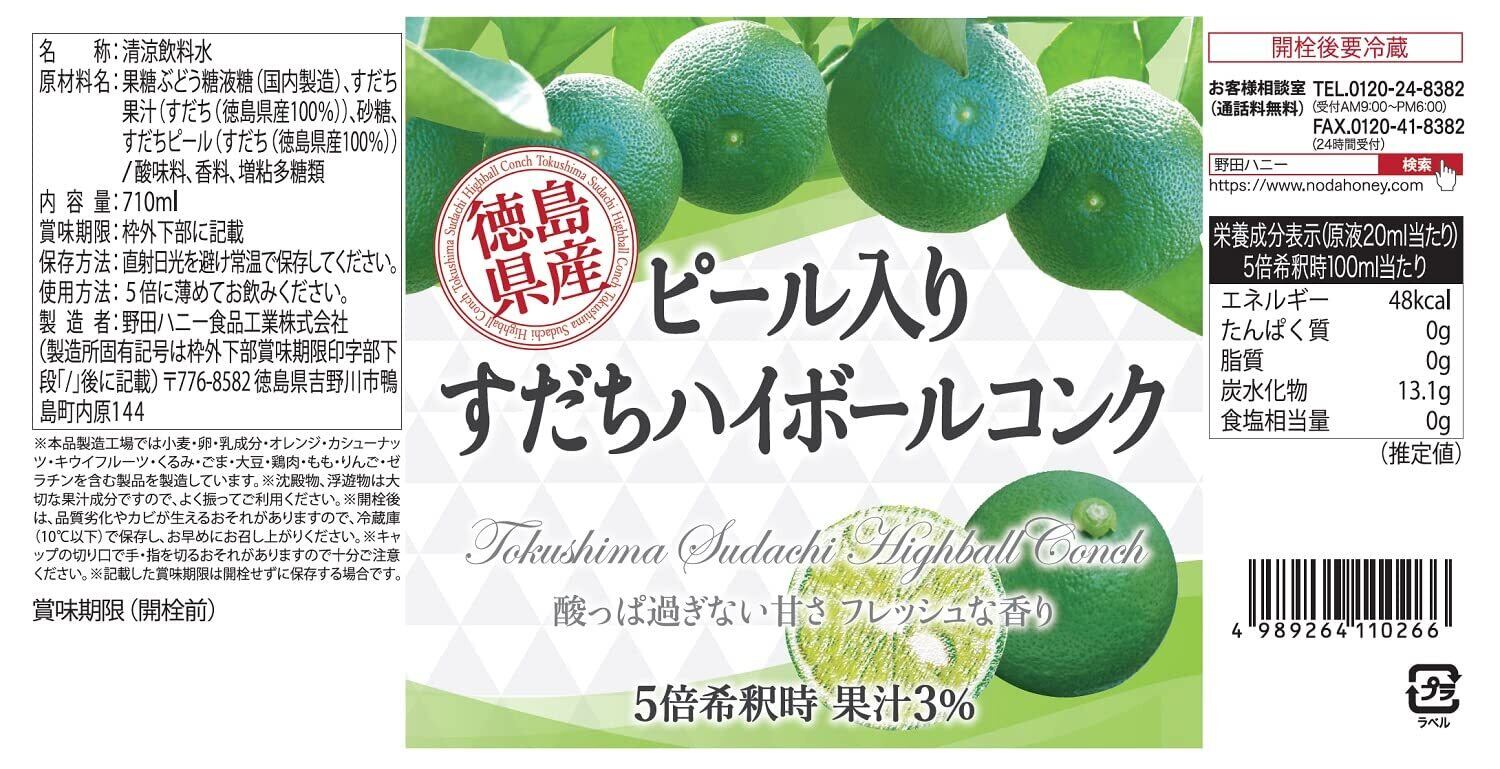 野田ハニー ピール入り すだちハイボールコンク 710ml