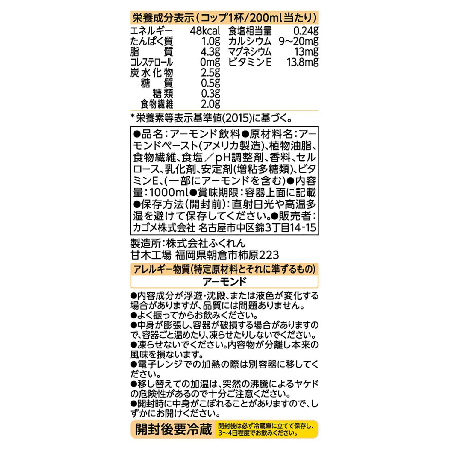 アーモンドペースト(アメリカ製造)、植物油脂、食物繊維、食塩/pH調整剤、香料、セルロース、乳化剤、安定剤(増粘多糖類)、ビタミンE、(一部にアーモンドを含む)