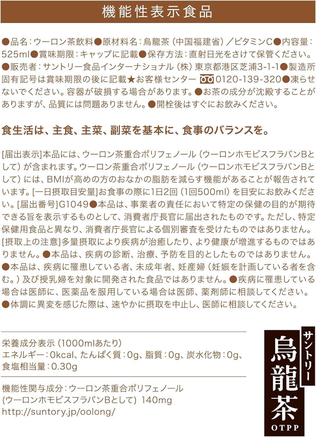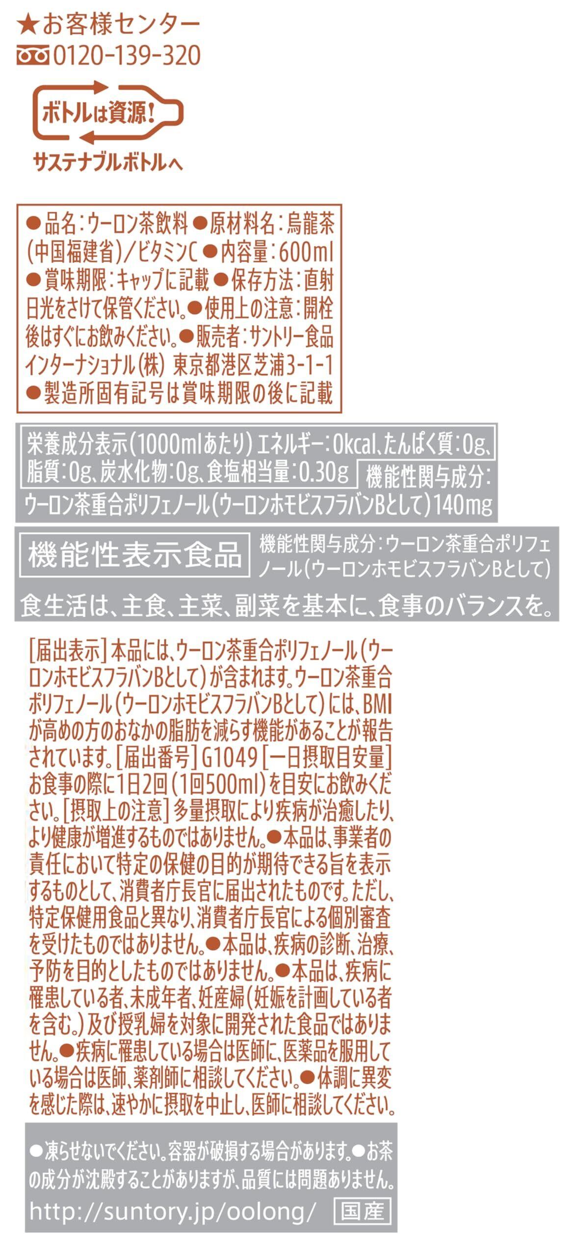 本品には、ウーロン茶重合ポリフェノール(ウーロンホモビスフラバンBとして)が含まれます。 ウーロン茶重合ポリフェノール(ウーロンホモビスフラバンBとして)には、BMIが高めの方のおなかの脂肪を減らす機能があることが報告されています。 【一日摂取目安量】お食事の際に1日2回(1回500ml)を目安にお飲みください。 【摂取上の注意】多量摂取により疾病が治癒したり、より健康が増進するものではありません。 [機能性表示食品] サントリー 烏龍茶 ラベルレス お茶 ペットボトル 600ml×24本は、コクがあるのにすっきり美味しい烏龍茶です。すっきりした味わいの秘密は、豊富に含まれている「ウーロン茶ポリフェノール」にあります。サントリー烏龍茶では、福建省北部にある武夷山(ぶいさん)やその周辺で育つ茶葉を使用していますが、この地域で育つウーロン茶は、半発酵のウーロン茶の中において、比較的発酵度が高いという特長があります。そのため、健康成分である「ウーロン茶ポリフェノール」がたくさん含まれており、飲み続けても渋みが残らない味わいを実現しました。しっかりとしたコクとキレのある味わい、お口さっぱりサントリー烏龍茶をお楽しみください。 ●烏龍茶本来のコク・濃さはそのままに、後口がよりすっきりした味わい ●茶葉抽出技術により、烏龍茶ならではのコク・香りは感じつつも、飲み続けても渋みが残らない設計 ●ペットボトル 500ml 525ml 550ml 600ml 680ml 700mlの容器体をお探しの方に ●茶 お茶 緑茶 ほうじ茶 ジャスミン茶 濃茶 濃い茶 濃い味 玄米茶 烏龍茶 紅茶 無糖茶などをお探しの方に ●水 ミネラルウォーター 天然水や炭酸水の代わりに、無糖のお茶を飲んでホッと一息 ●無糖飲料のため、毎日のお食事 お弁当 会議 通勤時のお供に ●機能性表示食品 おいしく、おなかの脂肪を減らす ダイエット 減量 ボディメイクのお供に 【ブランド紹介】サントリー烏龍茶は、1981年に缶入り烏龍茶として発売して以来40年以上もの間、多くのお客様から日々の水分補給として、また食事のお供としてご好評いただいているロングセラーブランドです。