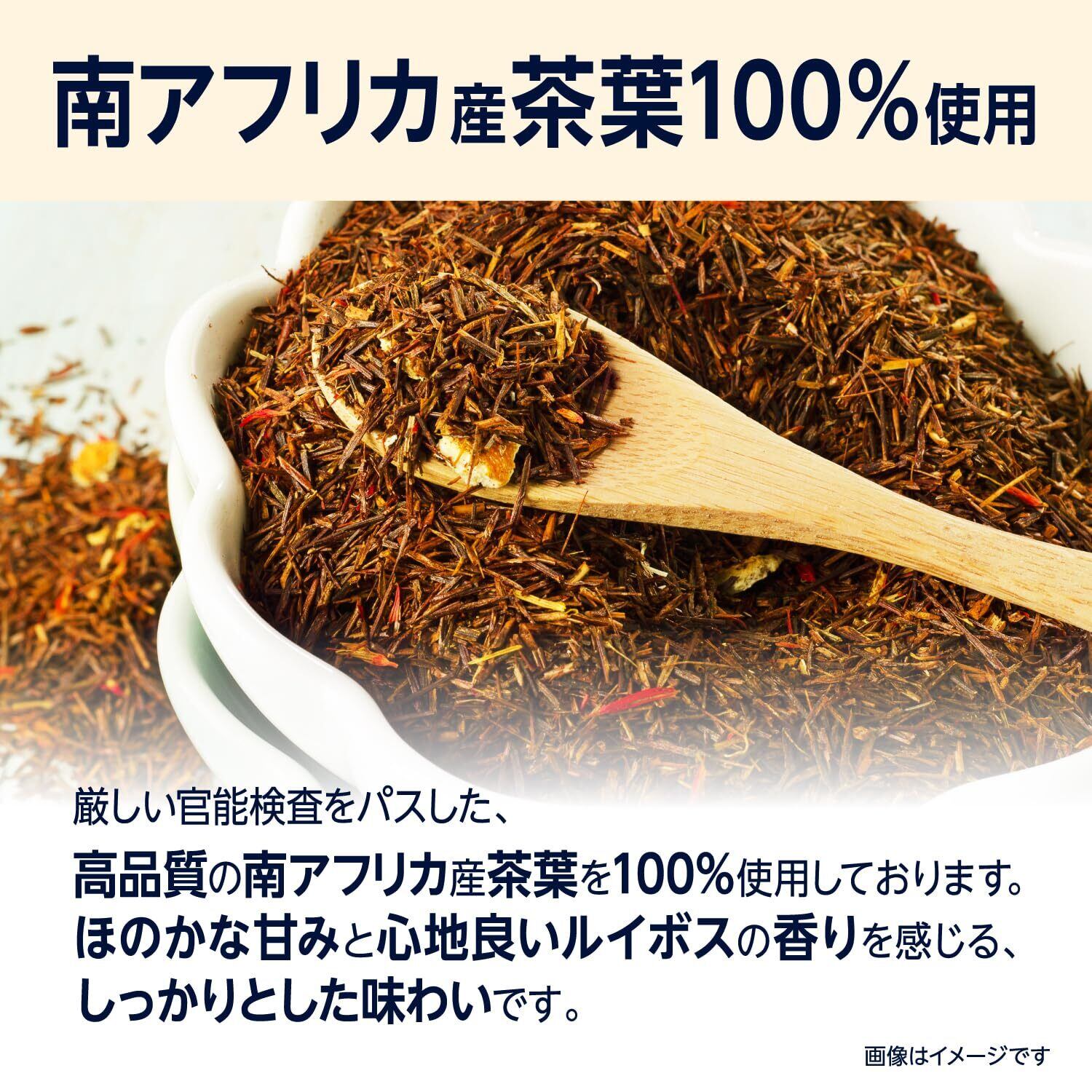 厳しい官能検査をパスした、高品質の南アフリカ産茶葉を100%使用。ほのかな甘みと心地良いルイボスの香りを感じる、しっかりとした味わいです。ラベルレス商品にすることにより環境配慮型製品となっております。