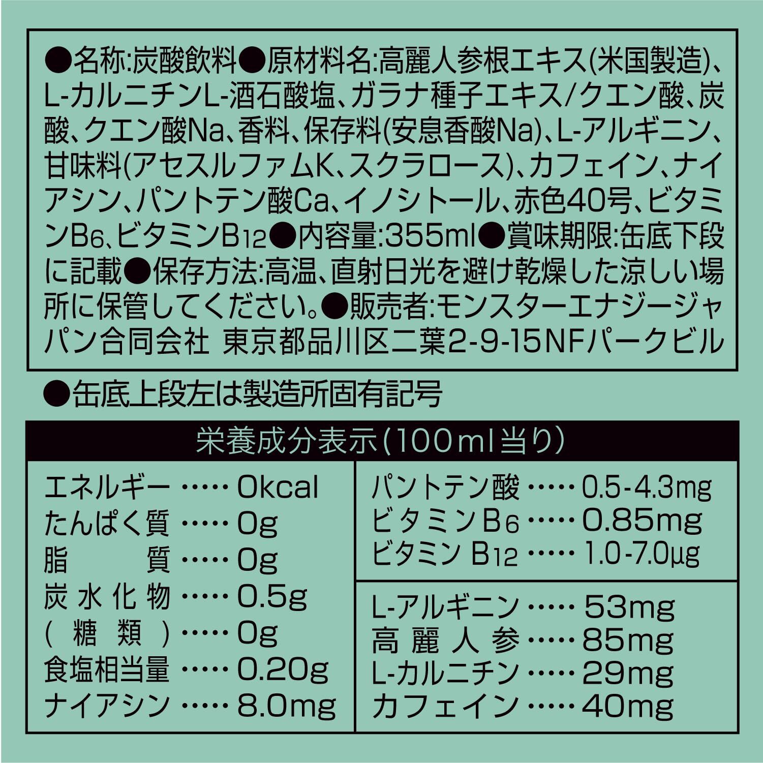高麗人参根エキス(米国製造)、L-カルニチンL-酒石酸塩、ガラナ種子エキス/クエン酸、炭酸、クエン酸Na、香料、保存料(安息香酸Na)、L-アルギニン、甘味料(アセスルファムK、スクラロース)、カフェイン、ナイアシン、パントテン酸Ca、イノシトール、赤色40号、ビタミンB6、ビタミンB12