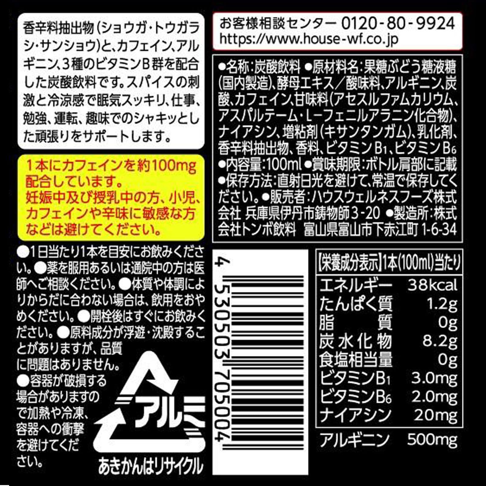 冴えた刺激で眠気をスッキリさせ、仕事・勉強・ドライブ・趣味での頑張りをサポートします。 シャキッとしたい朝や、眠気をスッキリさせて頑張りたい夕方、夜。気分転換、切替にも! ・香辛料抽出物(ショウガ、トウガラシ・サンショウ)とカフェイン、アルギニン、ビタミンB群3種を配合。 ・冷涼感でスッキリとするメントールを配合。 ・ジンジャーレモン味(無果汁) ・炭酸飲料