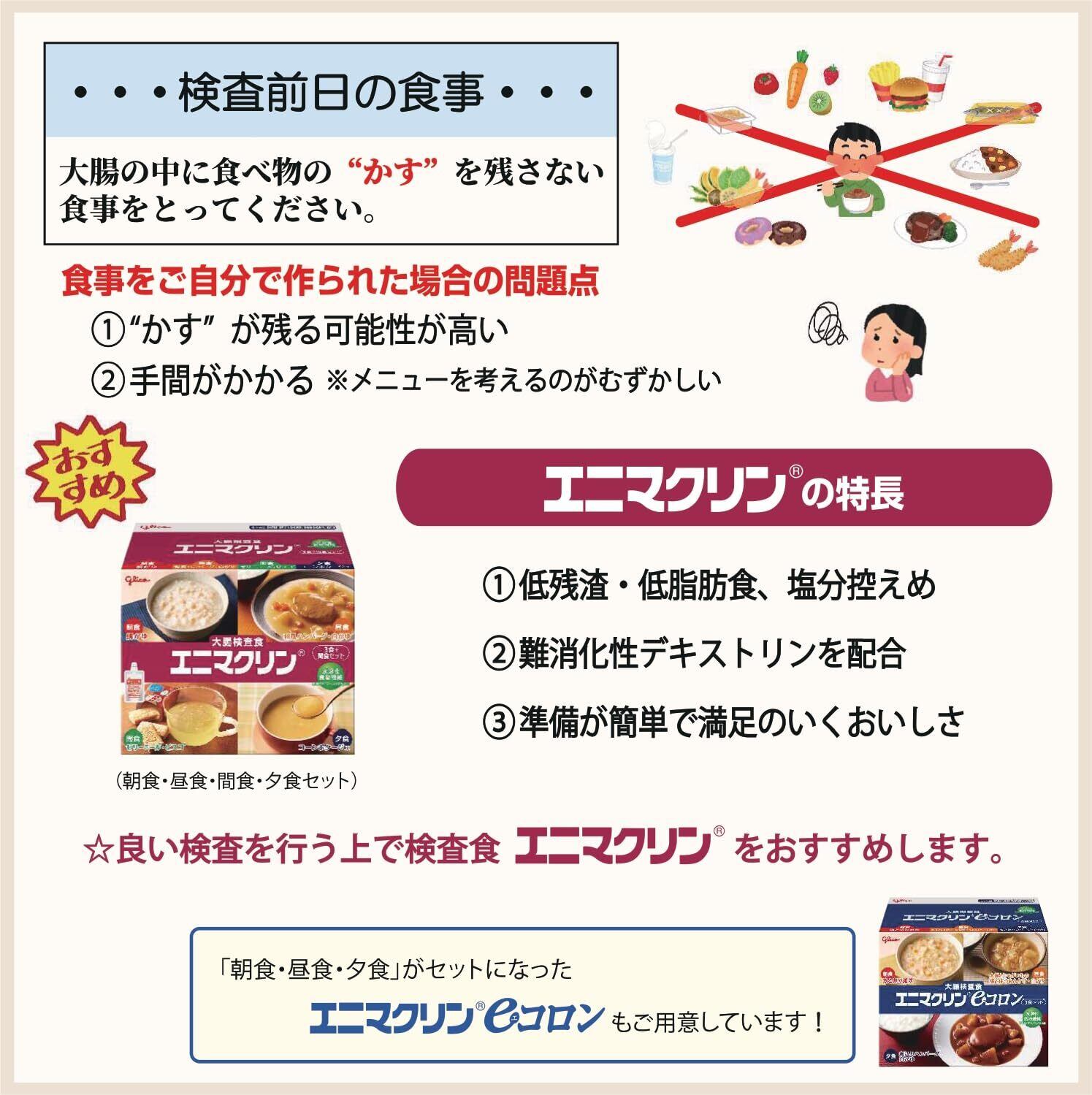 エニマクリン, 大腸検査食セット, 3食+間食セット, 朝食:鯛がゆ 昼食:和風ハンバーグ・白がゆ 間食:ゼリーミール・ビスコ 夕食:コーンポタージュ