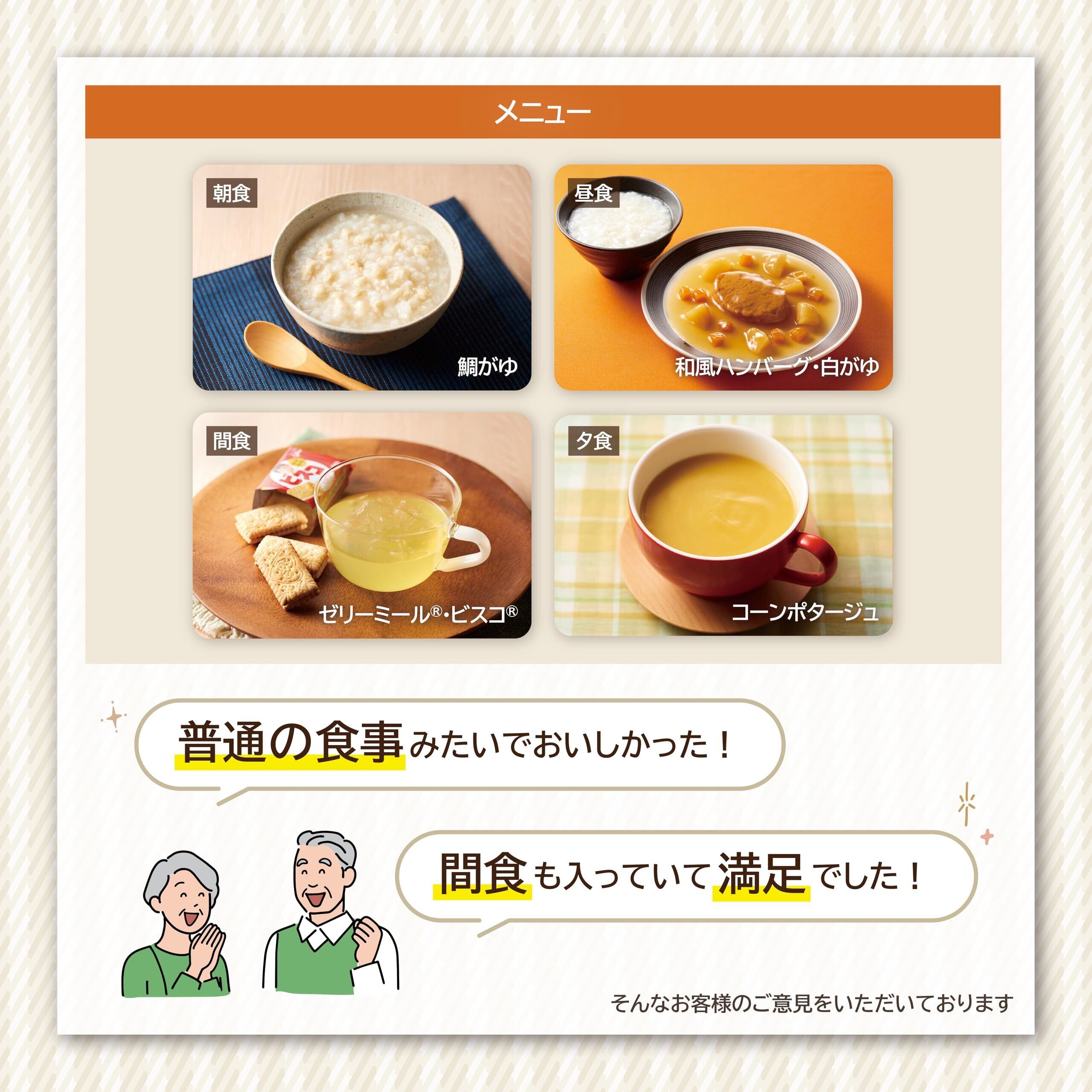 鯛がゆ (米飯類(かゆ)):うるち米(国産) たい、デキストリン、かつおエキス、こんぶエキス、食塩、(一部に小麦を含む):和風ハンバーグ (ハンバーグ):ハンバーグ [鶏肉、たまねぎ、豆腐、豚脂、つなぎ(パン粉)、しょうゆ、 発酵調味料、香辛料、 たん白加水分解物、砂糖、食塩、大豆油/加工デンプン、リン酸塩(Na,K)、調味料(アミノ酸)](国内製造)、ソース [野菜(じゃがいも、にんじん)、 難消化性デキストリン、還元水あめ、しょうゆ、デキストリン、砂糖、かつおエキス、チキンブイヨン、こんぶエキス、しょうがペースト、酵母エキス、たん白加水分解物/増粘剤(加工デンプン) 調味料 (アミノ酸等) ]、(一部に乳成分・小麦・大豆・鶏肉・豚肉を含む):白がゆ (米飯類 (かゆ)):うるち米(国産)、ゼラチン、(一部にゼラチンを含む):ゼリーミール ® (18%りんご果汁入り飲料 (ゼリー飲料) デキストリン(国内製造)、 果糖ぶどう糖液糖、 りんご濃縮果汁、ポリデキストロース、乳糖果糖オリゴ糖/ゲル化剤(増粘多糖類、寒天)、酸味料、香料、V.C、乳化剤、ナイアシン、V.E、V.B2、V.B1、V.A、V.D、(一部に大食 豆・りんごを含む):ビスコ® (ビスケット): 小麦粉 (国内製造)、砂糖、ショートニング、乳糖、植物油脂、全粉乳、 イヌリン、食塩、でん粉、小麦たんぱく、 乳酸菌 / 炭酸Ca、 膨脹剤、香料、乳化剤、調味料(アミノ酸)、V.B1、V.B2、V.D、(一部に乳成分・小麦を含む):コーンポタージュ (スープ (ポタージュ)): とうもろこしペースト(アメリカ製造)、 還元水あめ、豆乳、デキストリン、小麦粉、濃縮乳、砂糖、なたね油、ラード、チキンブイヨンパウダー、チーズパウダー、食塩、酵母エキス、たん白加水分解物、香辛料/増粘剤(加工デンプン)、調味料(アミノ酸等)、香料、カロチノイド色素、(一部に乳成分・小麦・大豆・鶏肉を含む)