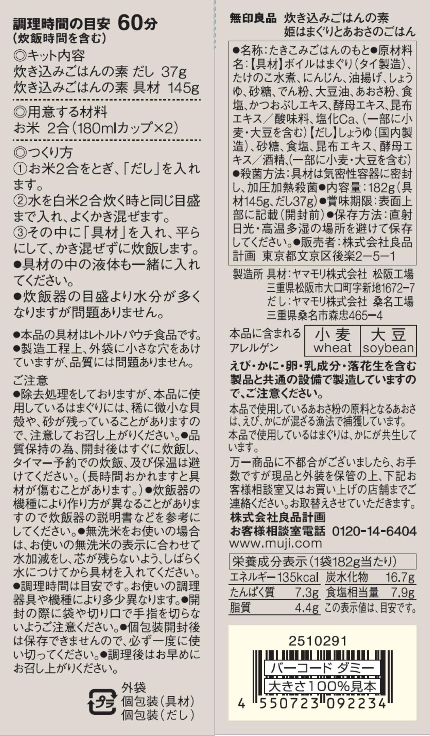 無印良品 炊き込みごはんの素 姫はまぐりとあおさのごはん 182g(お米2合用2~3人前) 23092234